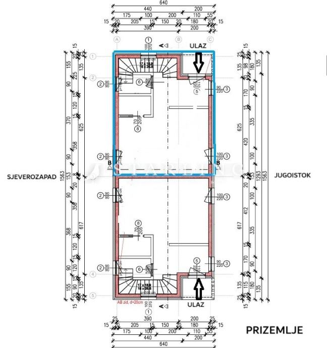 - PRIZEMLJA: hodnik, stubište, wc, ostava, dnevni boravak s kuhinjom i blagovaonicom