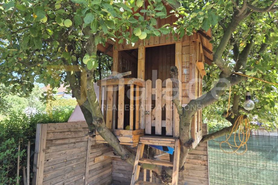 Kući pripada dvorište površine 104 m2 u kojem se nalazi roštilj i kućica na drvetu.U blizini se nalazi svi sadržaji potrebni za život: tramvajska stanica, dječji vrtić, osnovna škola, dom zdravlja, Opus arena, trgovine, kafići i restorani. Udaljenost do centra grada i trga Ante Starčevića. je 2,5 kilometara.