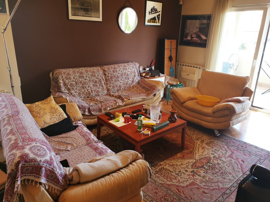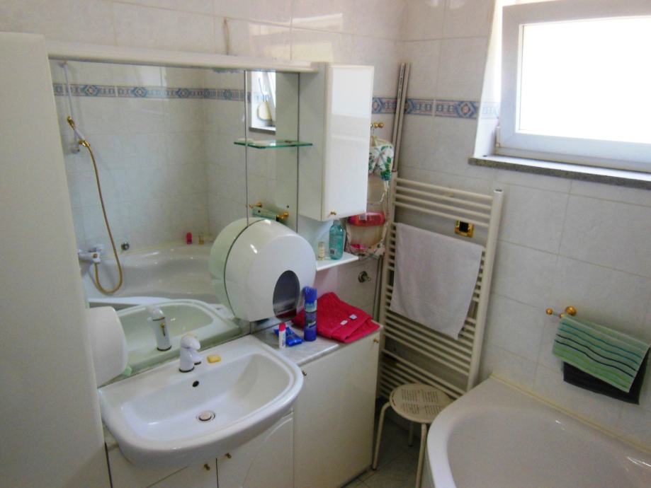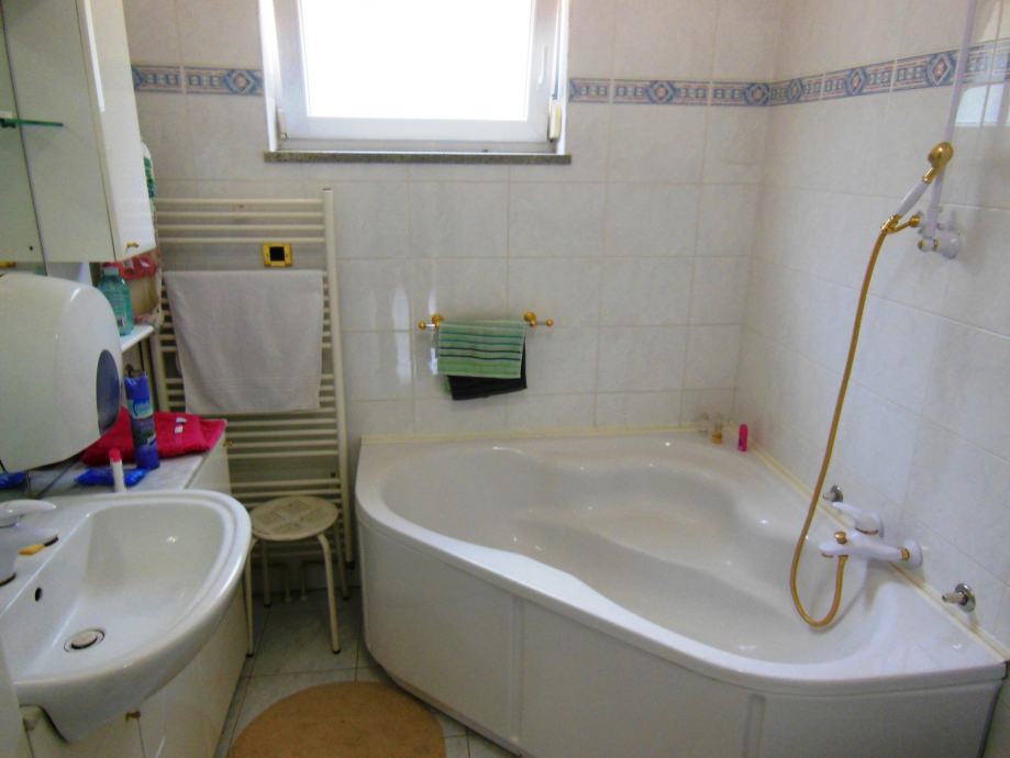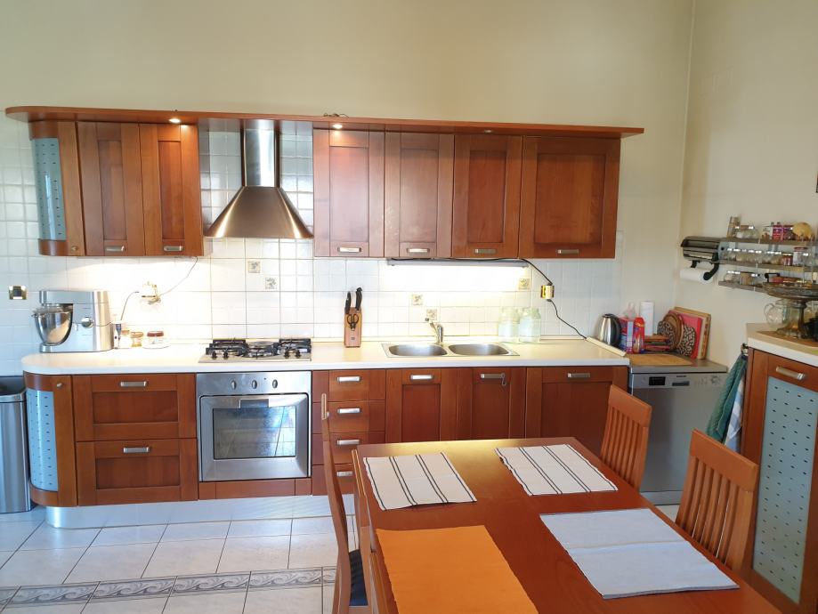 Kat: glavna soba sa svojim malim hodnikom, WC-om i jacuzziem. Druga soba, WC sa kotlom za centralno grijanje i veš mašinom. Dnevni boravak/kuhinja/blagovaona od 48m2 sa dimnjakom. Kosi krov se diže od 2,5 na 4 m. Dva natkrivena balkona, veći je 11 m2 za stol i 8 stolica. Centralni hodnik. Video portafon.