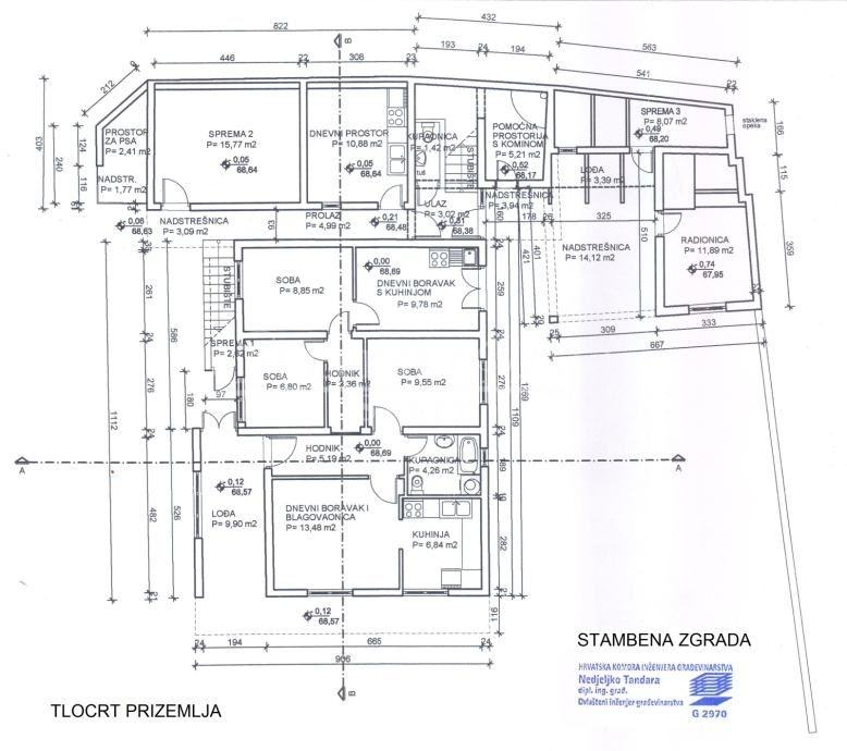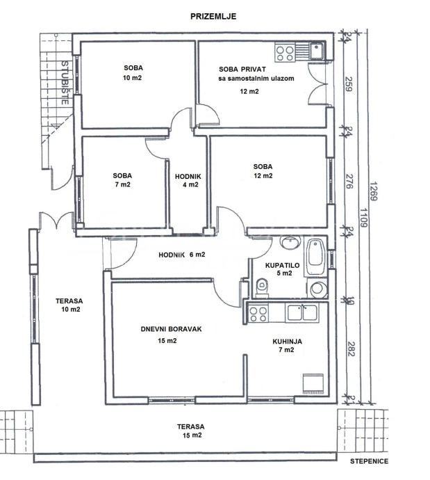 Prizemlje: Dva useljiva stana (100 m²), svaki s vlastitim ulazom i klima uređajem.