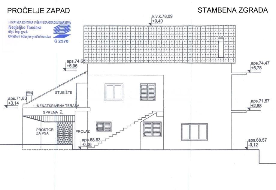 Prodaje se samostojeća kuća površine 305 m² (prizemlje + 2 kata) na zemljištu od 1254 m². Kuća je južno orijentirana s pogledom na more s viših etaža.