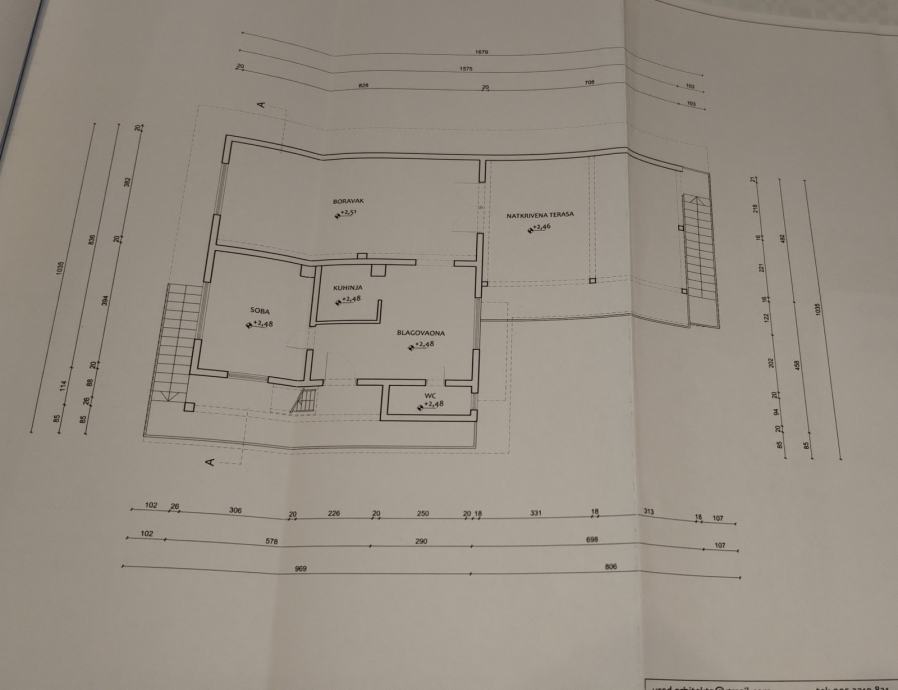 -kat 119,09m2 (kuhinja, prostrani dnevni boravak od 35m2, spavaća soba, kupaonica sa tušem i velika i prostrana natkrivena terasa od 45m2)