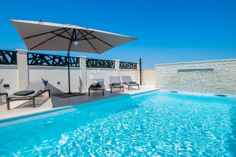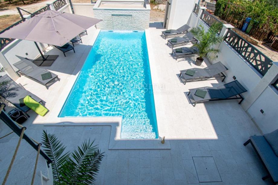 Kuća ima ukupno tri etaže - suteren, prizemlje, 1. kat (S + P + 1). Unutar zgrade nalaze se četiri apartmana. Na otvorenoj površini smješteni su grijani bazen površine 32 m2, roštilj, vanjski tuš i wc.