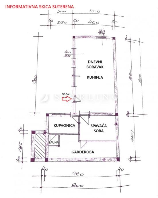 - SUTEREN površine 65 m2: dnevni boravak s kuhinjom i blagovaonicom, spavaća soba, velika garderoba, kupaonica s wc-om, sauna i hodnik.