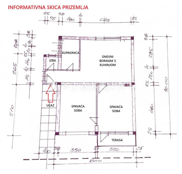 - DRUGI KAT površine 45 m2: dnevni boravak, dvije sobe, kupaonica s wc-om i izba.