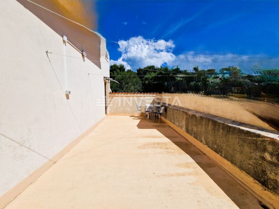 Na prvom katu imamo samostalnu stambenu jedinicu koja se sastoji od predsoblja, 3 spavaće sobe, 2 kupaone, kuhinje, blagavaonice, dnevnog boravka, ostave i velike terase. Na prvom katu se također nalazi još jedna dodatna 'krovna' terasa i ostava na koje se pristupa s unutarnjeg stubišta.
