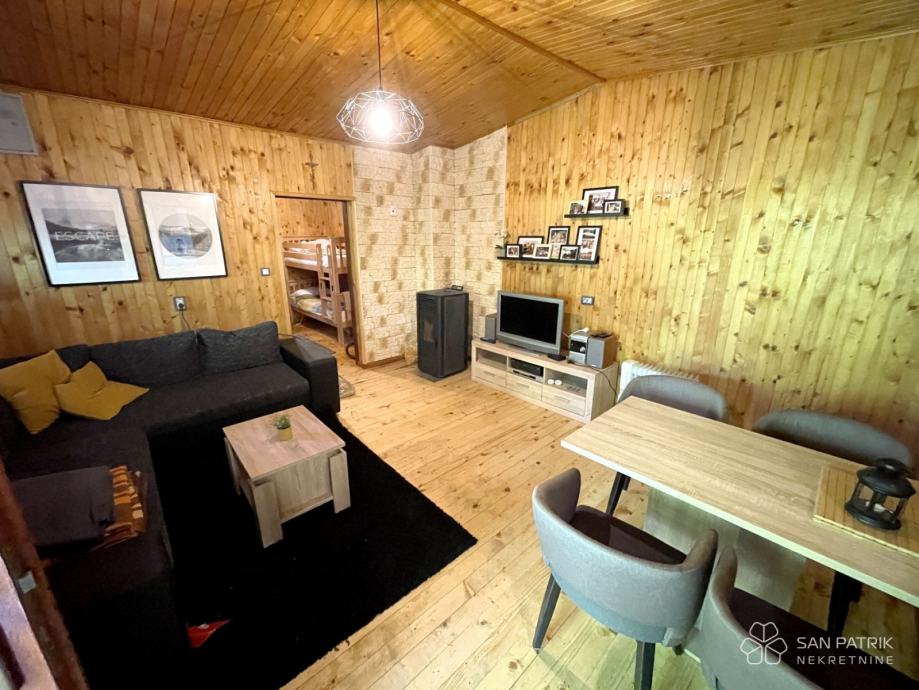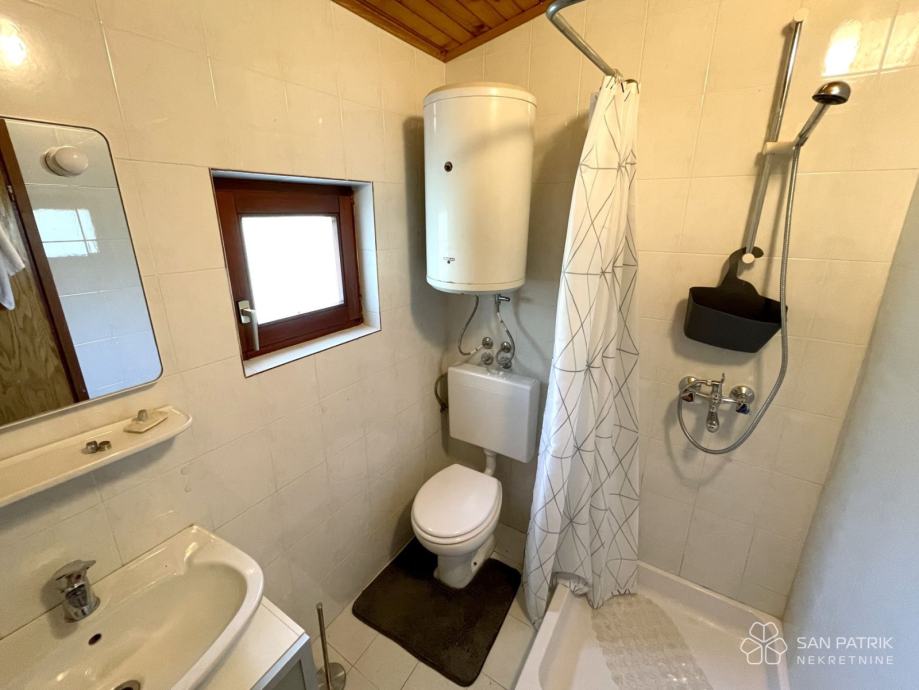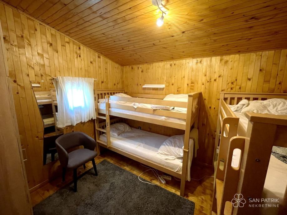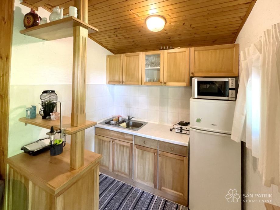 Kuća se sastoji od spavaće sobe, dnevnog boravka s kuhinjom i blagovaonicom, kupaonice, velike natkrivene terase i uređene okućnice s kaminom. Priključena je na struju i vodu.