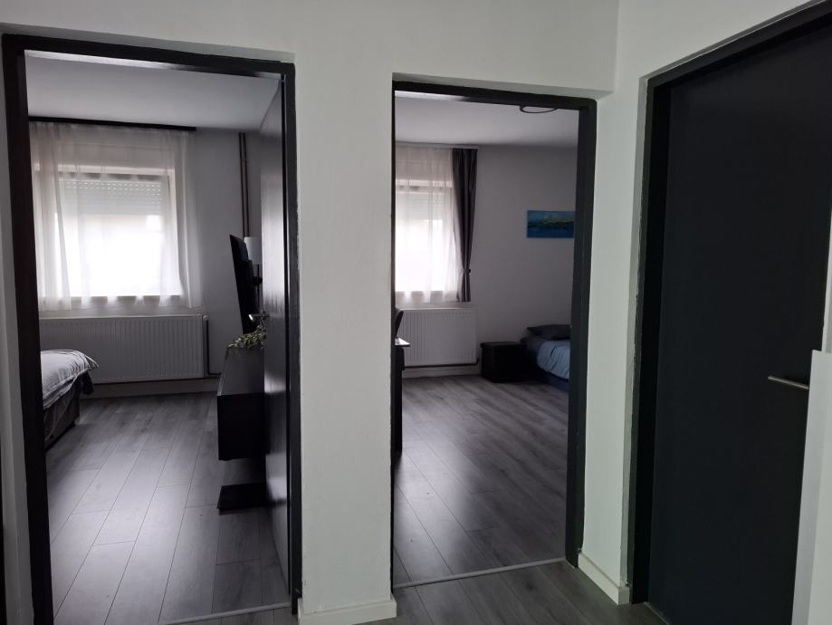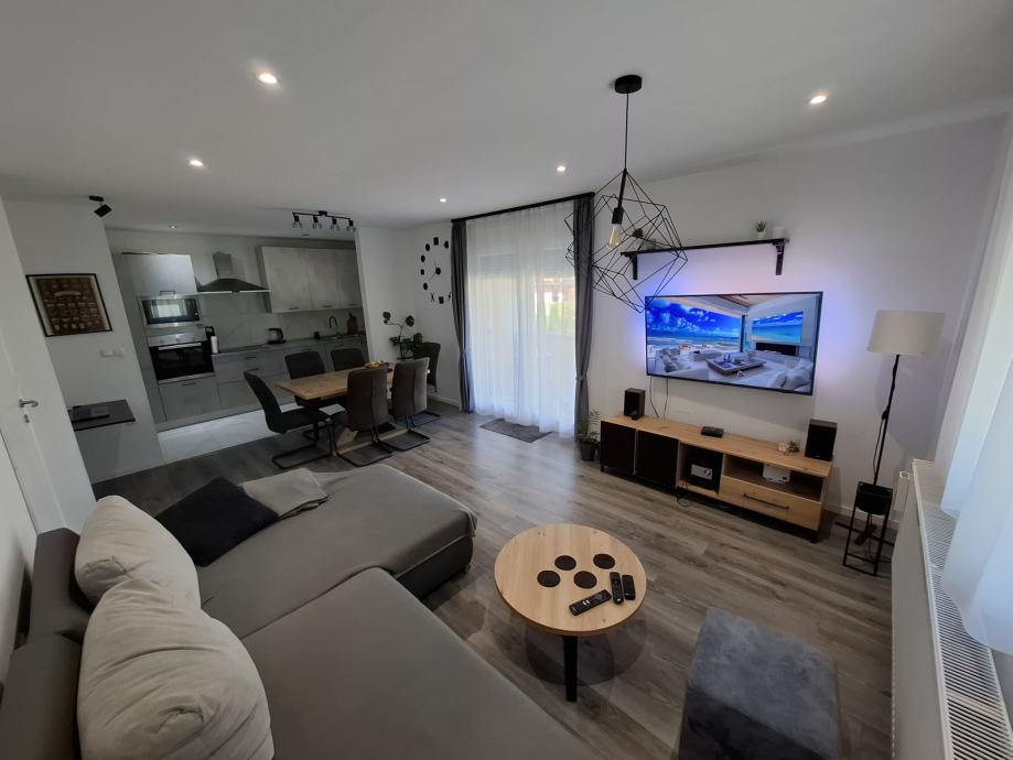 • Podovi: laminat (moderno, novo) + keramika u kuhinji i kupaonicama