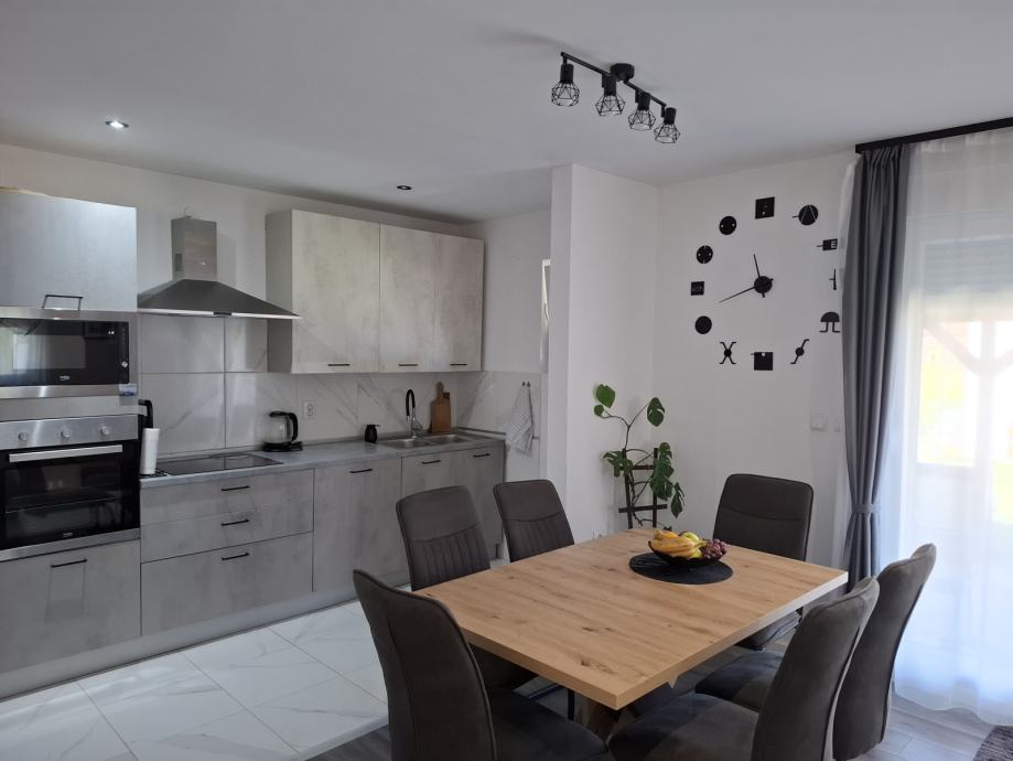 • Namještaj i aparati: moderna kuhinja s el. uređajima, kutna garnitura, blagovaonski stol i stolice, TV uređaji, spavaće sobe, kupaonski namještaj, walk-in tuš, kutna kada