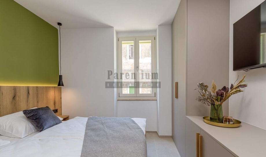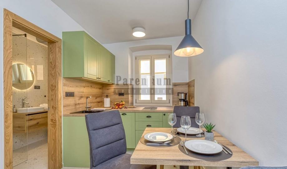 Apartman u potkrovlju ima jednu spavaću sobu, kupaonicu, kuhinju i blagovaonicu s dnevnim boravkom.