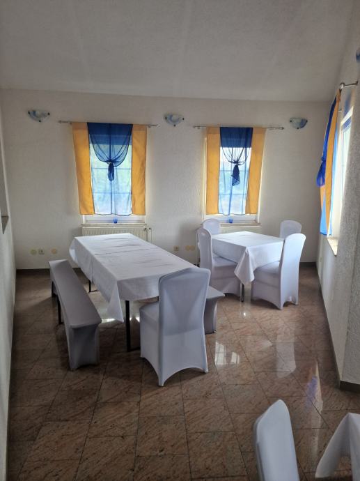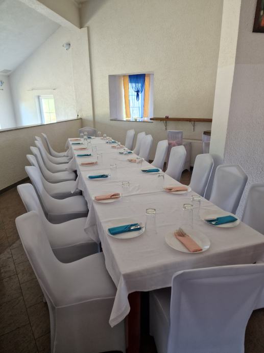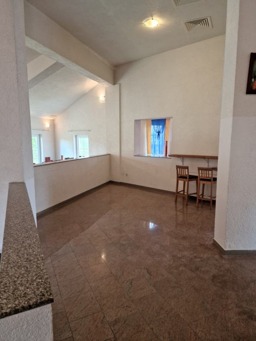 Prodaje se kuća koja se sastoji od potpuno namještenog stana od 80m2 na prvom katu, poslovnog prostora namijenjenog za restoran od 180m2 (kapaciteta do 90 osoba), te se u prizemlju nalazi 6 nedovršenih soba sa kupaonicom i wc-om namijenjenih za prenočište. Ukupna kvadratura objekta je 380m2.