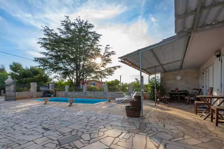 Bazen je izgrađen prije nekoliko godina i opremljen vanjskim tušem. Povezan je sa solarnim sustavom na krovu, koji omogućuje prirodno zagrijavanje vode tijekom sunčanih dana. Kuća se prodaje namještena, uz mogućnost uklanjanja namještaja prema želji kupca.