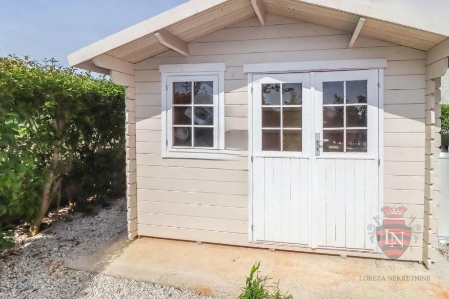 Vanjski sadržaji uključuju ljetnu kuhinju s privlačnim kaminom, natkrivenu terasu za nezaboravne trenutke na otvorenom i natkriveni parking za dva vozila, što osigurava praktičnost i sigurnost. Odvojena zgrada za pohranu na stražnjem dijelu savršena je za čuvanje opreme za bazen i vrt.