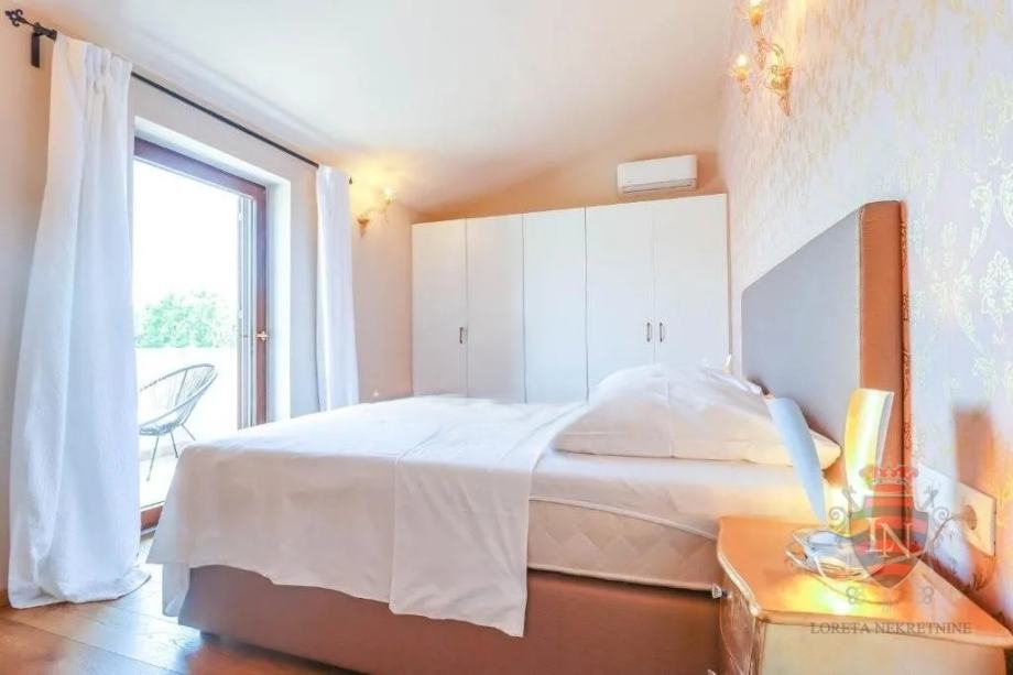 Elegantnim stepenicama se penjemo na prvi kat gdje se nalazi prostrani hodnik, kupaonica i tri ukusno namještene spavaće sobe, od kojih jedna ima vlastitu kupaonicu. Svaka soba, opremljena kvalitetnim namještajem, satelitskom TV i klima uređajem, obećava udobnost i privatnost. Jedna spavaća soba nudi pristup balkonu s kojeg se pruža panoramski pogled na očaravajuće okruženje.