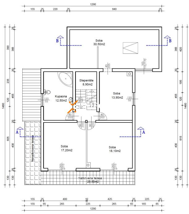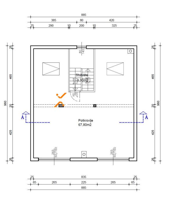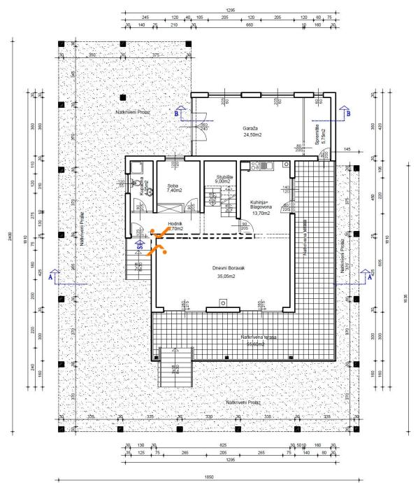 U prizemlju se nalazi hodnik, jedna spavaća soba, kupaonica, kuhinja s blagovaonicom i dnevnim boravkom, garaža, dodatno spremište uz garažu te natkrivena terasa. Unutarnje stepenice vode na prvi kat gdje se nalaze hodnik, tri spavaće sobe, kupaonica, još jedna kuhinja te djelomično natkrivena terasa. U potkrovlju se nalazi jedna veća prostorija, trenutačno pregrađena u više ostava.