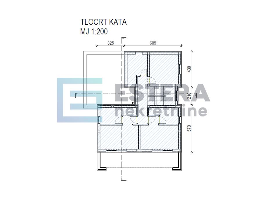 Unutarnjim stubištem dolazi se na kat gdje se nalazi hodnik, 3 spavaće sobe svaka sa svojom kupaonicom, a dvije spavaće sobe imaju izlaz na lođu. Ukupna tlocrtna površina 1. kata je 85,80 m2.
