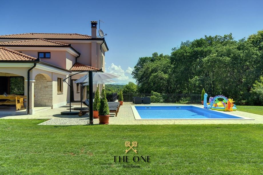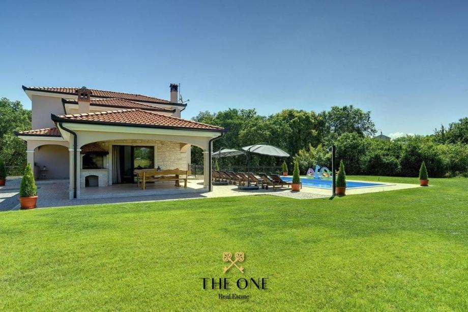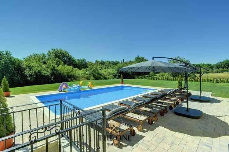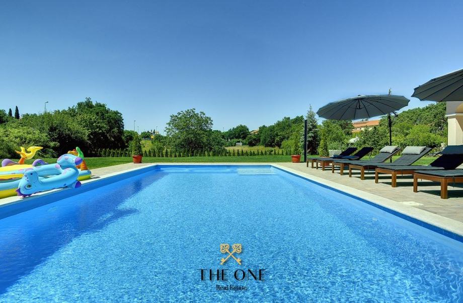 Na natkrivenoj terasi je vanjski roštilj i stol za blagovanje dok je odmah uz terasu bazen od 54m2 okružen sunčalištem s ležaljkama.