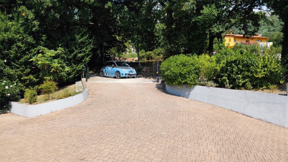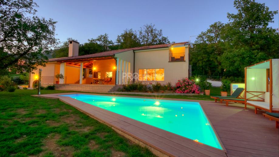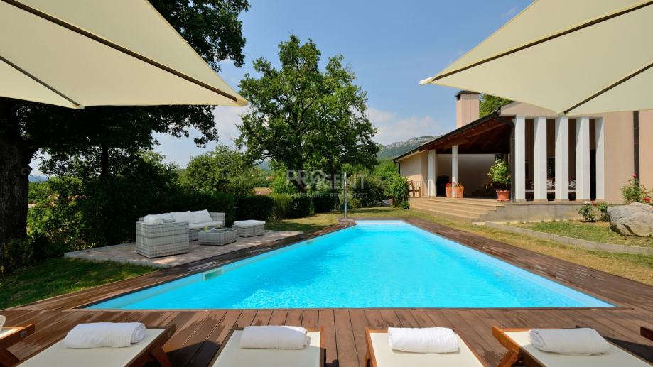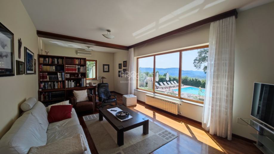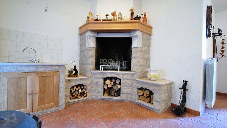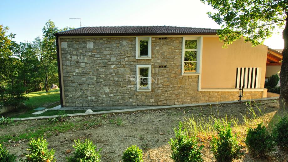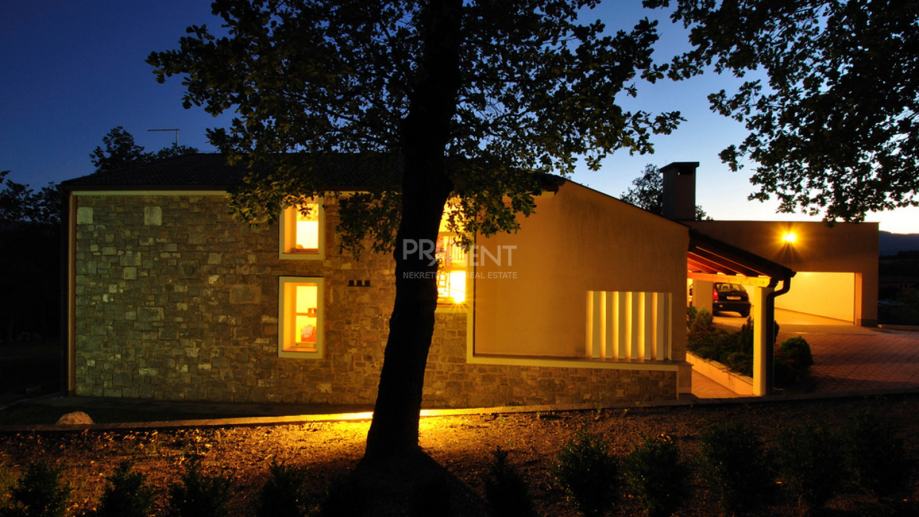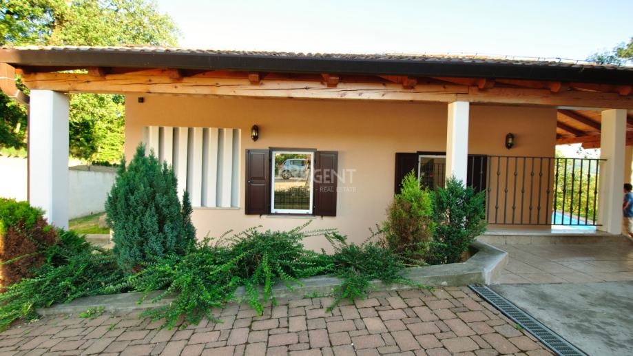 Kuća s bazenom, novije gradnje smještena na brežuljku s kojeg se pruža prekrasan pogled na Buzetsku kotlinu. Pored kuće je garaža površine 36 m2, konoba 30 m2 s kaminom i kotlovnicom. Prizemlje površine 110 m2, sastoji se od ulaza, blagovaone, dnevne sobe, kuhinje, ostave, WC-a, spavaće sobe s garderobom i kupatilom. Na katu (mansarda) površine 72 m2, nalaze se dvije spavaće sobe s kupatilima, garderobom, lođom, radnom sobom i ostavom. Kuća je građena s vrlo kvalitetnim materijalima.