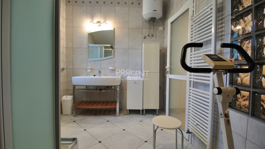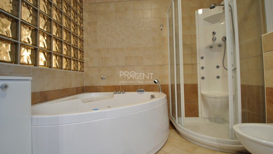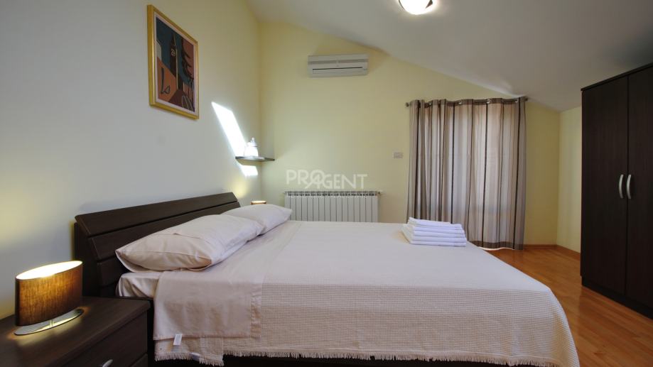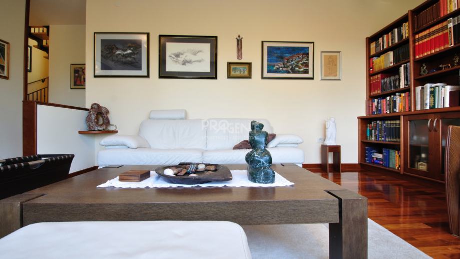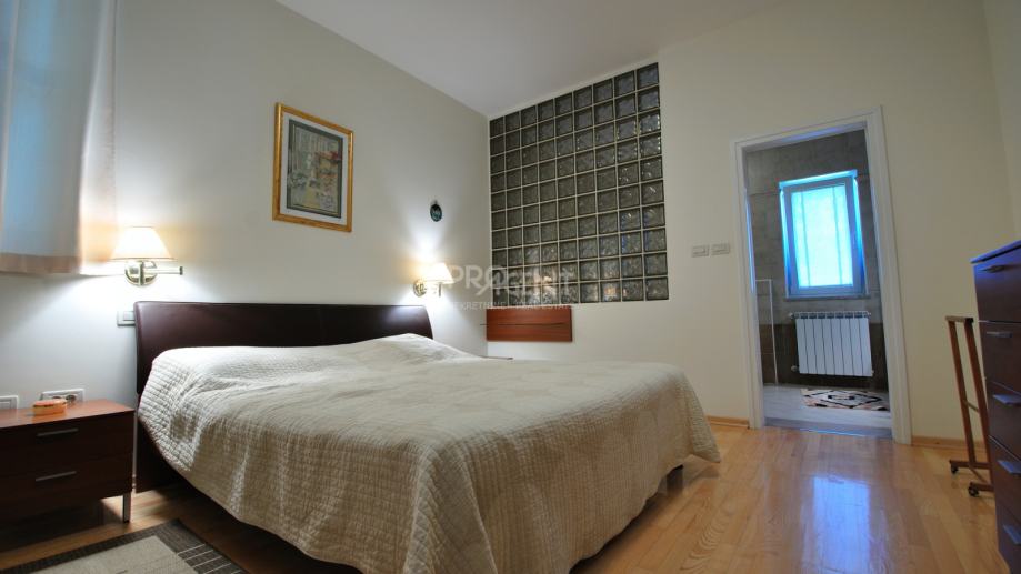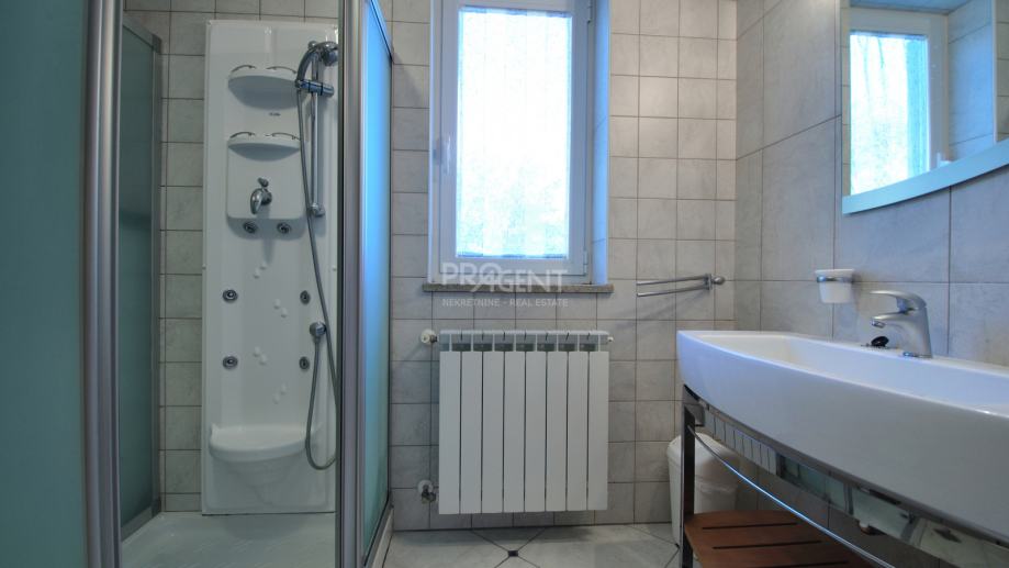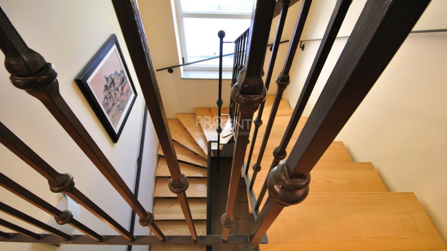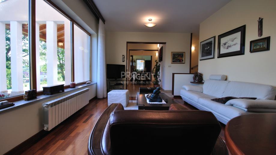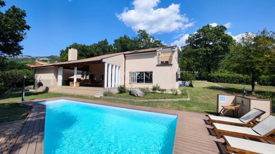 Kuća s bazenom, novije gradnje smještena na brežuljku s kojeg se pruža prekrasan pogled na Buzetsku kotlinu. Pored kuće je garaža površine 36 m2, konoba 30 m2 s kaminom i kotlovnicom. Prizemlje površine 110 m2, sastoji se od ulaza, blagovaone, dnevne sobe, kuhinje, ostave, WC-a, spavaće sobe s garderobom i kupatilom. Na katu (mansarda) površine 72 m2, nalaze se dvije spavaće sobe s kupatilima, garderobom, lođom, radnom sobom i ostavom. Kuća je građena s vrlo kvalitetnim materijalima.