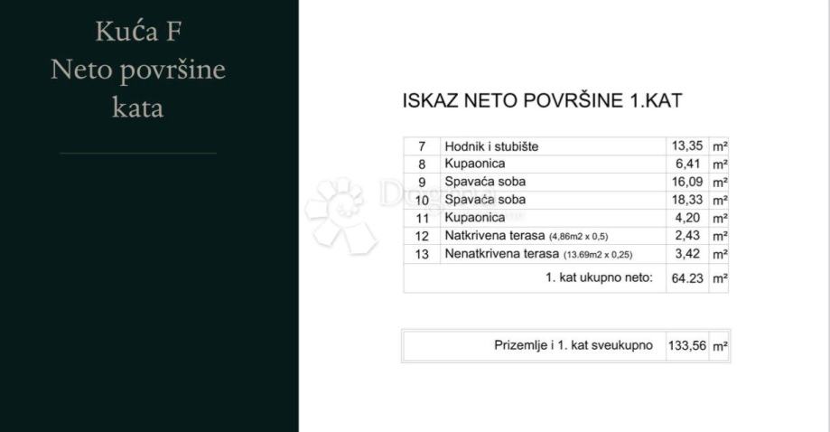 Stubište vodi na kat gdje će se smjestiti dvije spavaće sobe, svaka s vlastitom en-suite kupaonicom, te jedna natkrivena i dvije nenatkrivene terase. Ukupna stambena površina kata iznosit će 65,41 m², dok će cijela kuća imati ukupnu kvadraturu od 142,07 m².