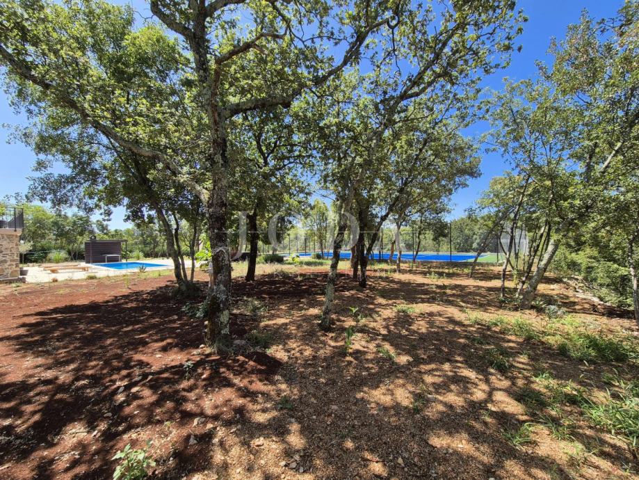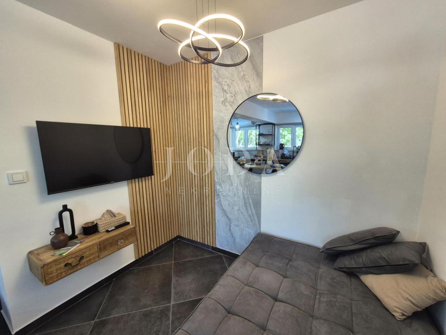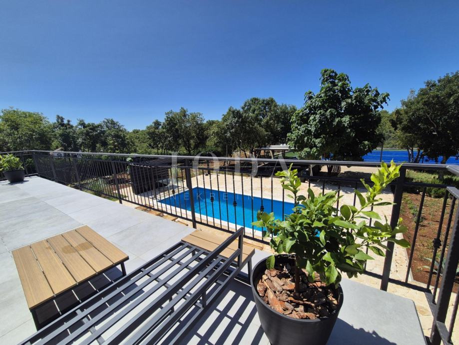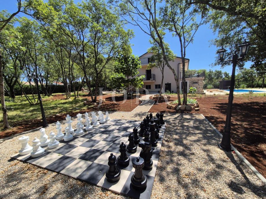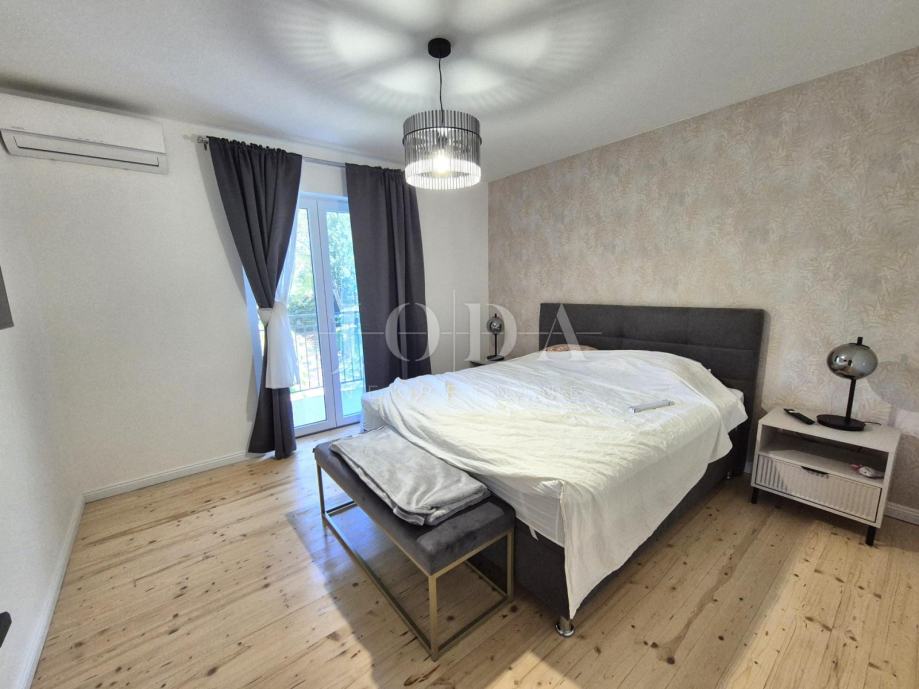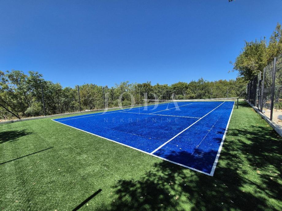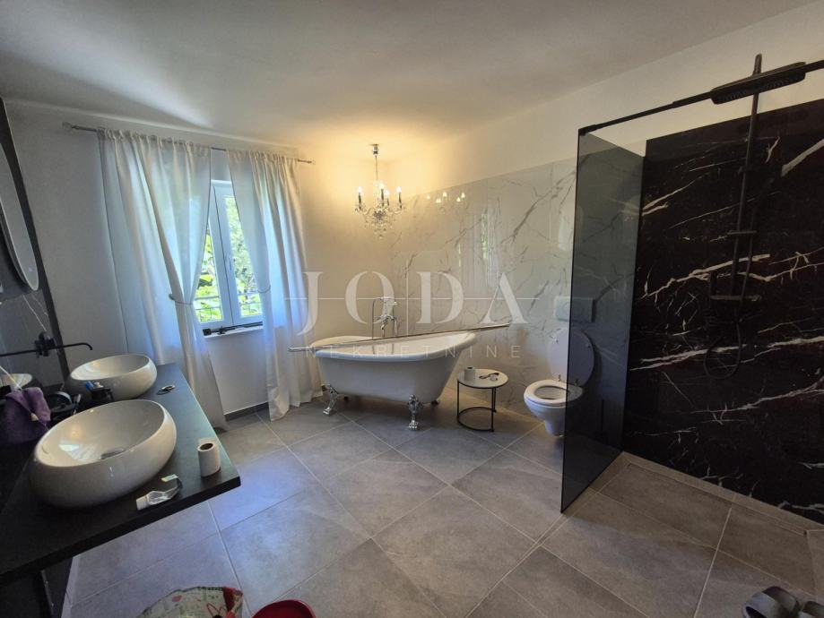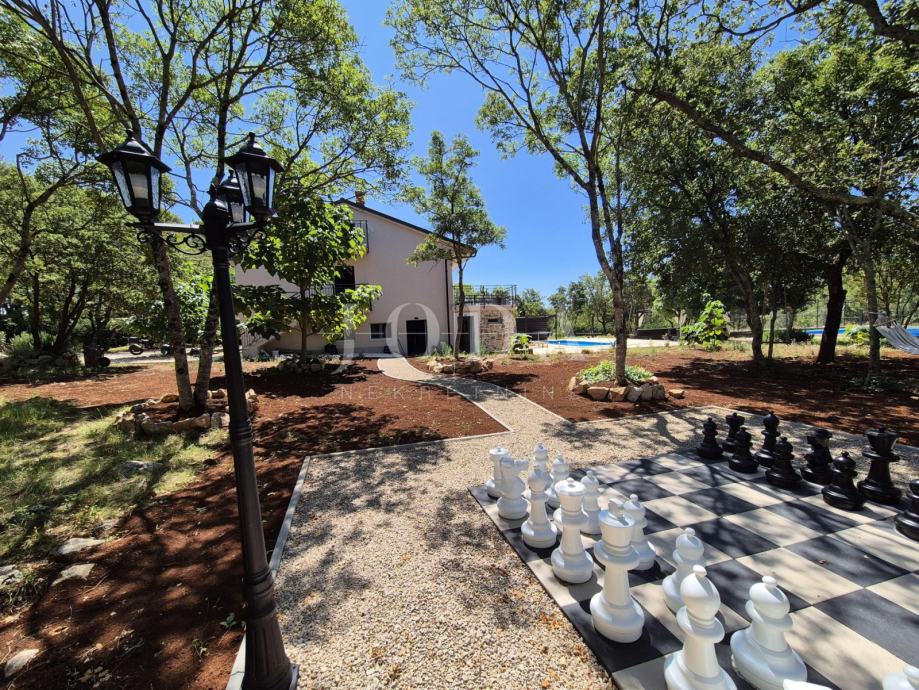 Kuća je kompletno adaptirana i trenutno je u završnoj fazi uređenja. Podijeljena je na podrum, prizemlje, kat i potkrovlje i ima brutto površinu 350 m2. Sastoji se od podruma i tri odvojene stambene jedinice. U prizemlju se nalazi jedan jednosobni apartman, jedan dvosobni apartman i prostorija sa saunom i teretanom. Na prvom katu se nalazi apartman koji ima dnevni boravak iz kojeg se izlazi na veliku terasu, kuhinju s blagovaonom, tri spavaće sobe, kupaonica, toalet i praonica. Nekretnina ima i potkrovlje stambene površine 30m2. Na prostranoj okućnici od 4000 m2 se nalazi parking za više automobila, bazen, sunčalište i teniski teren.