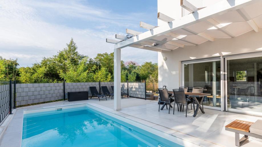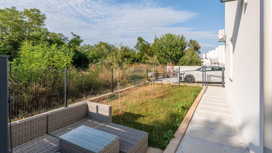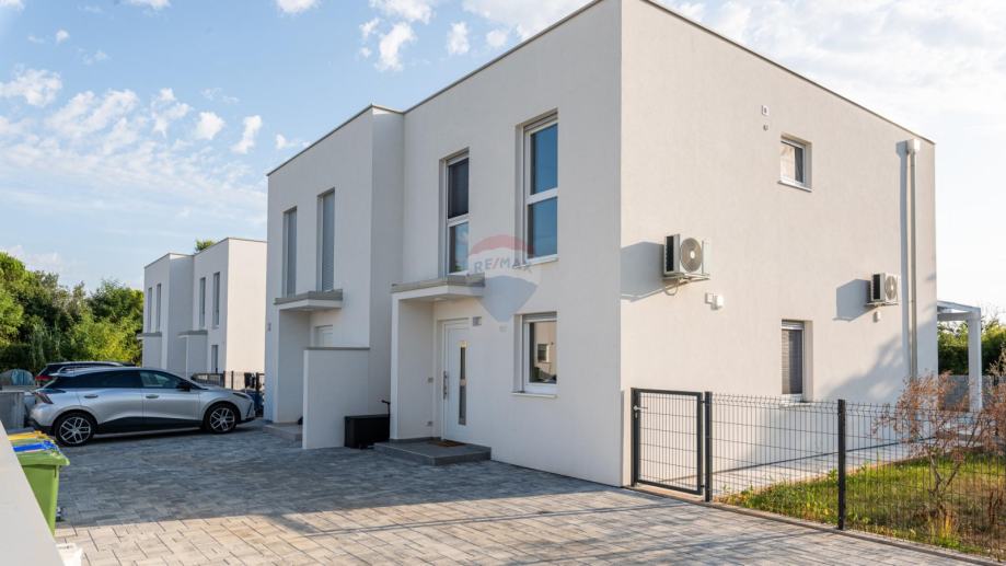 Ova moderna dvojna kuća smještena je na izuzetnoj lokaciji, u mirnoj ulici, posljednja u nizu, s potpunom privatnošću. Udaljena svega 300 metara od najljepše plaže u Umagu, kuća nudi idealan spoj komfora, kvalitete i blizine svih sadržaja.