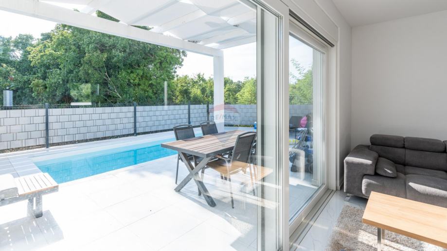 Prizemlje: Prostrana kuhinja, dnevni boravak, spremište i WC s izlazom na popločano dvorište s prekrasnim bazenom.
