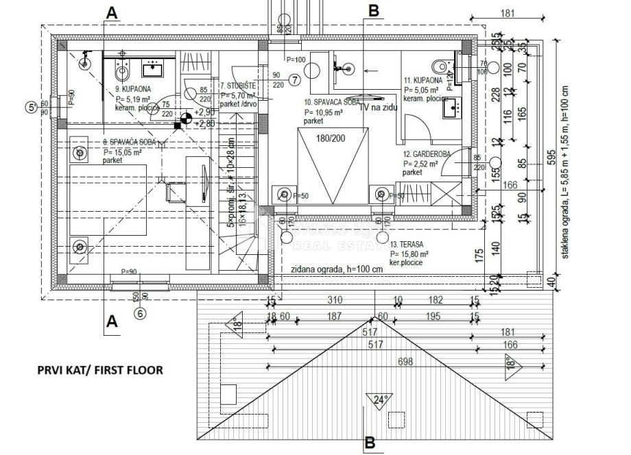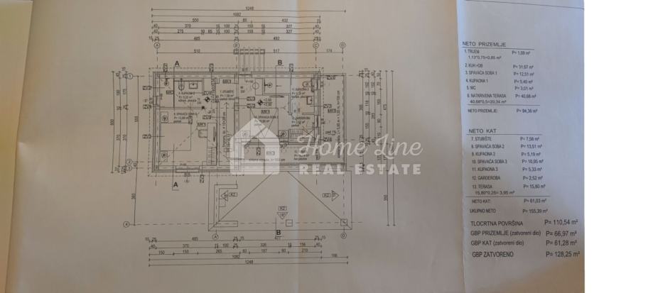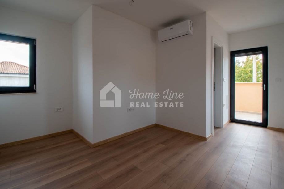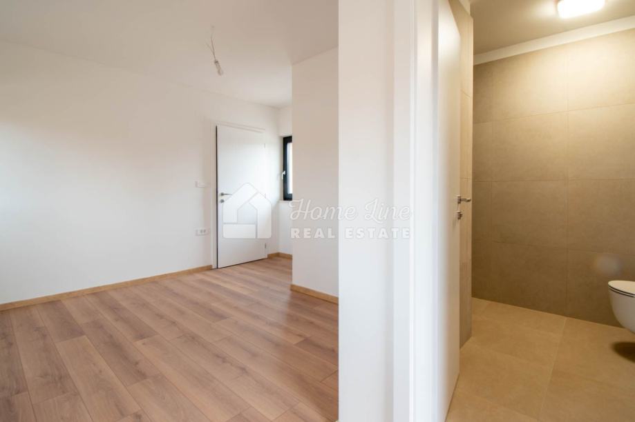 Kuća je slobodnostojeća, čini ju prizemlje i kat ukupne površine 155 m2. Prizemlje se sastoji od kuhinje i blagovaonice, dnevnog boravka s izlazom na natkrivenu terasu i ljetnu kuhinju, kupaonice i spavaće sobe. Unutarnje stepenice vode na kat koji se sastoji od dvije spavaće sobe, dvije kupaonice i terase. Kuću karakteriziraju kvalitetni materijali, prostranost i puno dnevnog svijetla. Opremljena je podnim grijanjem, klima uređajima te roletama s električnim upravljanjem.