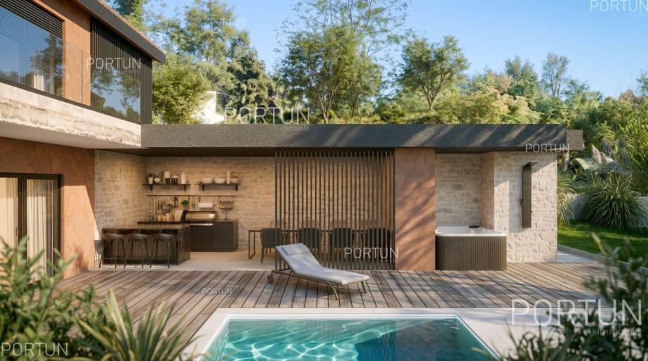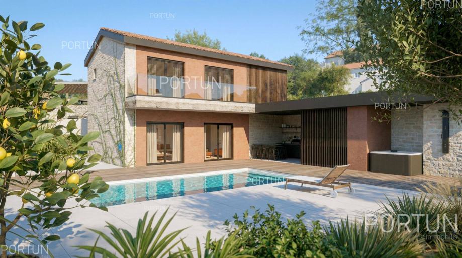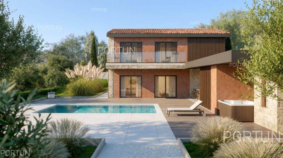 U mirnom okruženju nedaleko Motovuna, na svega 6 km udaljenosti, gradi se moderna kuća s bazenom, velikim staklenim otvorima i obiljem prirodnog svjetla. Projekt objedinjuje suvremenu arhitekturu, funkcionalan raspored i veliko zemljište s mediteranskim raslinjem. Dovršetak izgradnje planiran je za ljeto 2026.KLJUČNE OSOBINE✔ Mirna lokacija kraj Motovuna✔ Moderna gradnja i raspored✔ 2 Spavaće sobe | 2 Kupaonice | 1 WC✔ Bazen i ljetna kuhinja✔ Veliko zemljište 1.418 m2✔ Početak izgradnje 2025. g. | Izgradnja je u tijeku