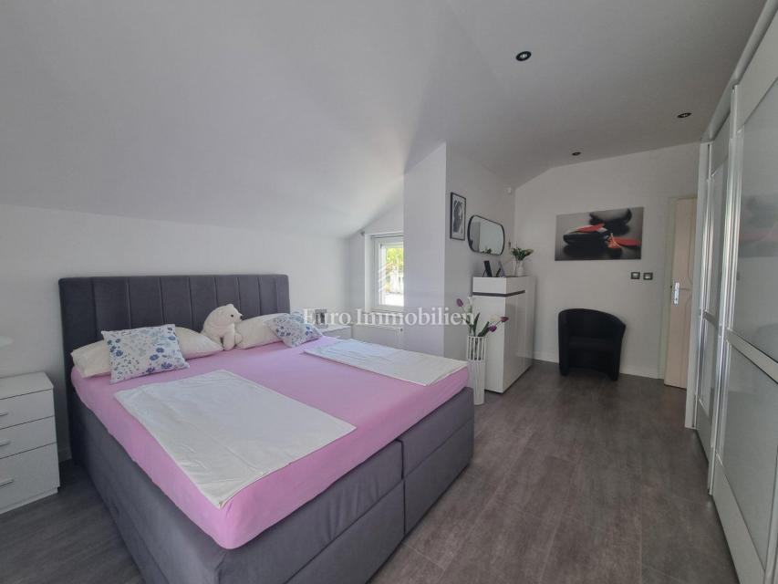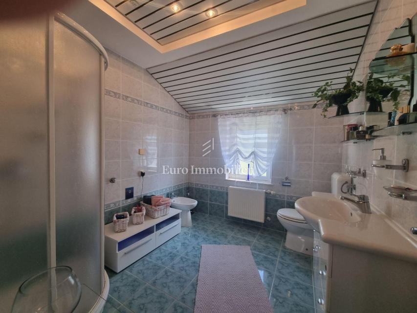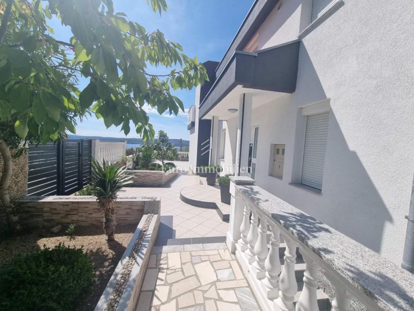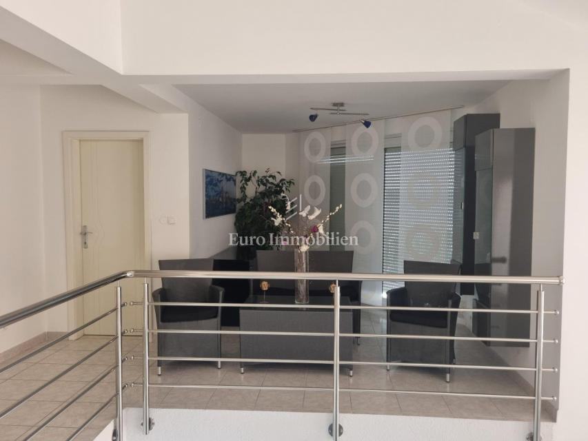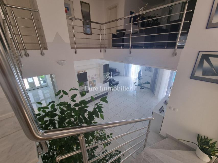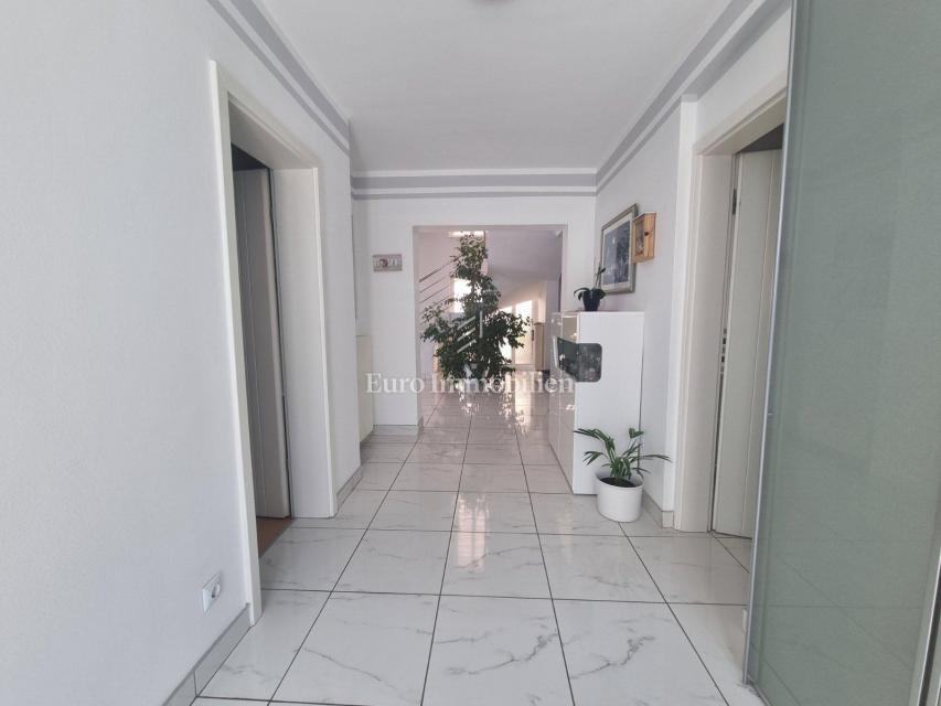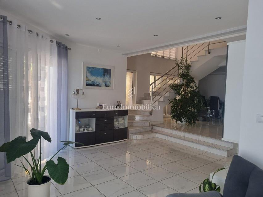 Kuća se sastoji od suterena, prizemlja i kata. Iza kuće nalazi se jedan jednosobni apartman, kotlovnica i pušnica. U suterenu kuće nalaze se dvije garaže i studio apartman. Prizemlje se sastoji od jedne spavaće sobe, kupaone, ulaznog hodnika te prostranog otvorenog prostora (kuhinja, blagovaona i dnevni boravak). Unutarnjim stepenicama ide se na kat gdje se nalaze dvije spavaće sobe s dvije kupaonice te prostrani hodnik. Jedna soba ima izlaz na balkon, a druga na terasu s koje se pruža panoramski pogled na more. Unutar okućnice osim bazena sa sunčalištem nalazi se prekrasni vrt s terasom i kaminom. Kuća za život, ali i za korištenje u turističke svrhe!