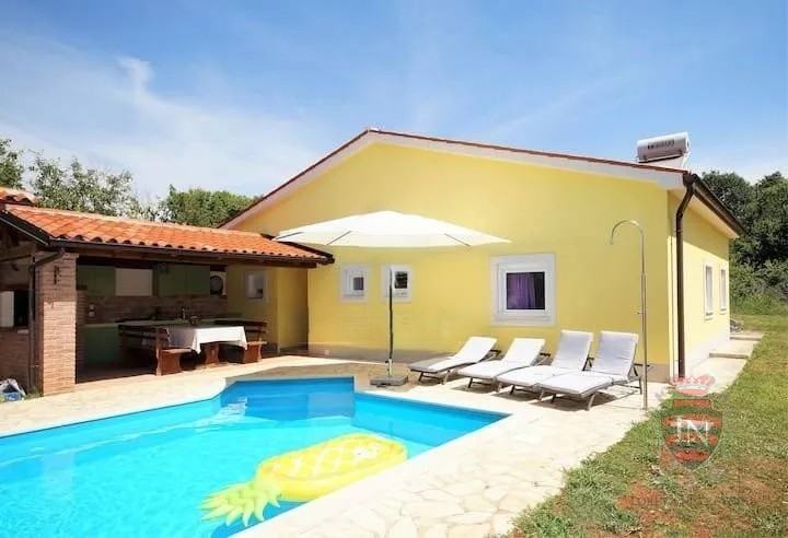 Okućnica je u potpunosti ograđena i održavana. Privući će vas atraktivan bazen veličine 34 m2, kao i natkrivena terasa s ljetnom kuhinjom i kaminom koja služi kao izvrsna lokacija za druženje i blagovanje, s pogledom na bazen i vrt.