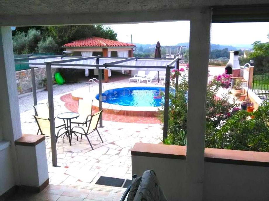 U dvorištu kuće ističu se dodatni sadržaji poput bazena, lijepe nadstrešnice i roštilja. Bazen pruža mogućnost osvježenja i zabave, dok nadstrešnica i roštilj stvaraju idealno mjesto za druženje s obitelji i prijateljima.