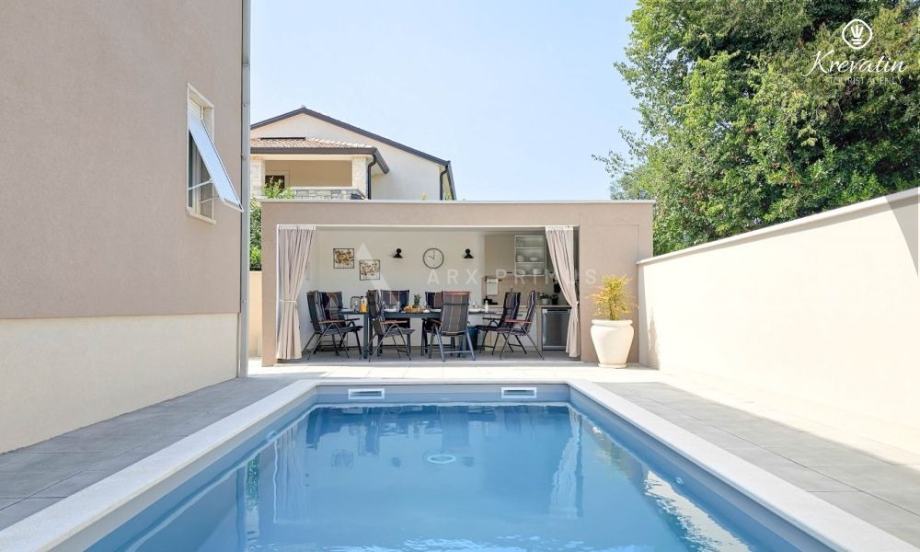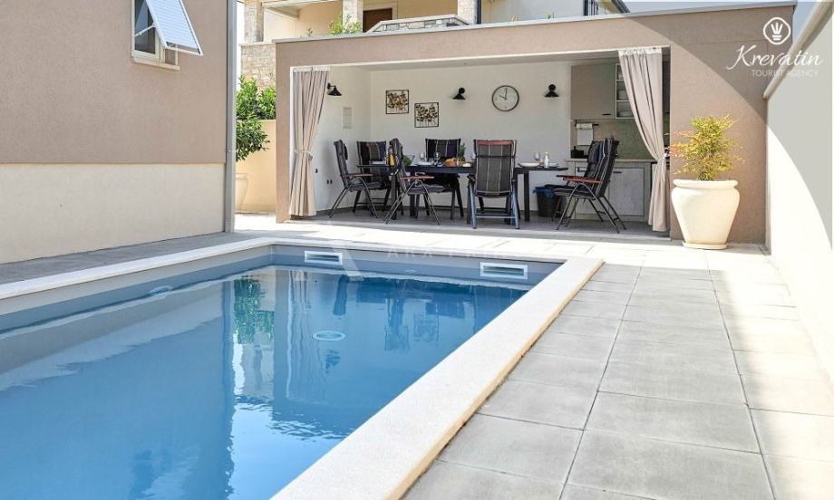 Kuća ima lijepo uređeno dvorište s ljetnom kuhinjom i bazenom.