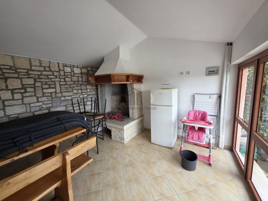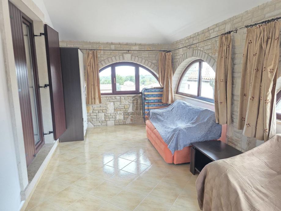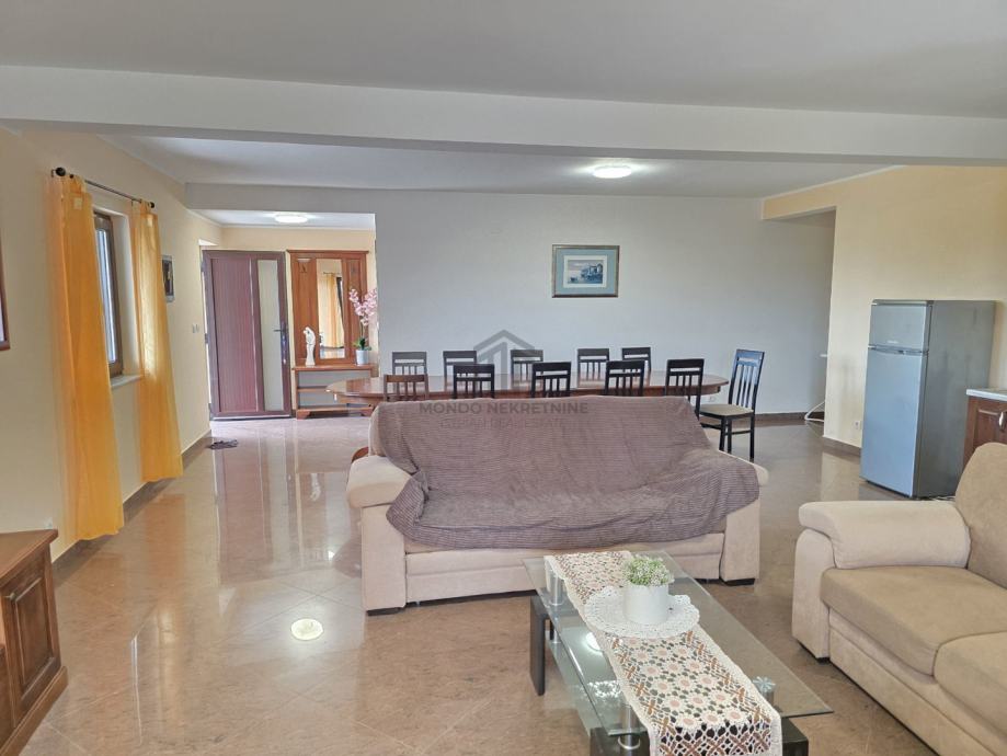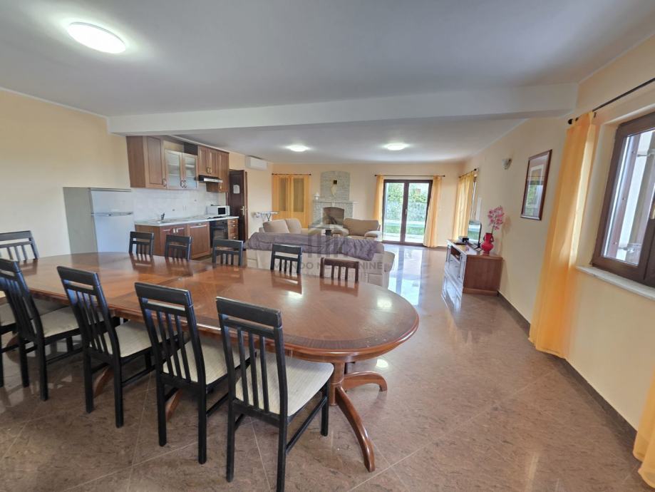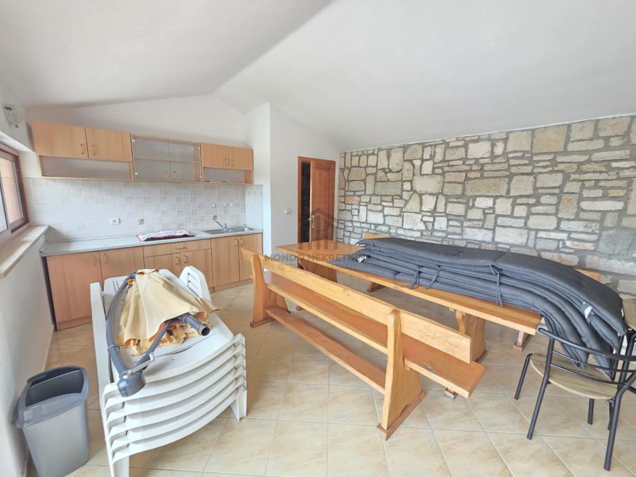U prizemlju se nalazi prostrani open space prostor koji objedinjuje dnevni boravak, blagovaonicu i kuhinju, iz kojeg se kroz više izlaza pristupa uređenom dvorištu. U istom dijelu nalazi se i WC.Na gornjoj etaži smještene su četiri spavaće sobe, svaka s vlastitom kupaonicom.U dvorištu se nalazi uređena konoba s kaminom.