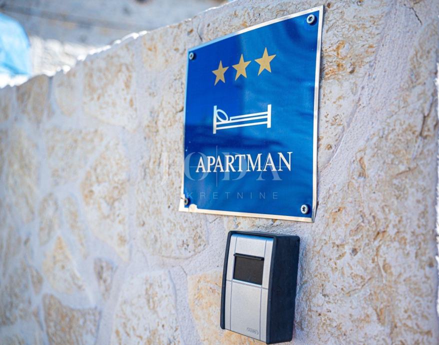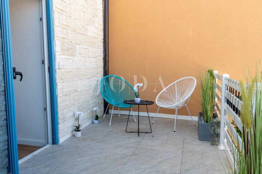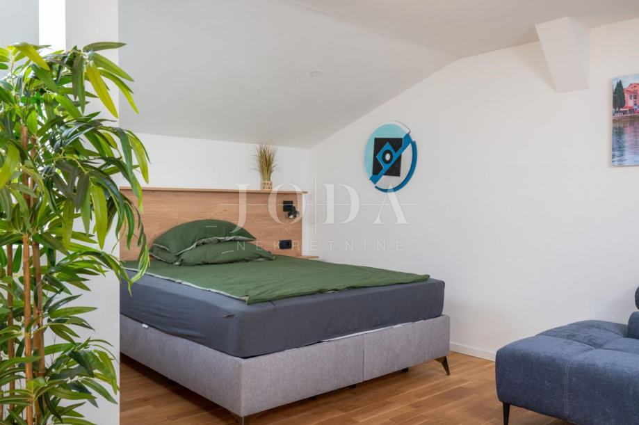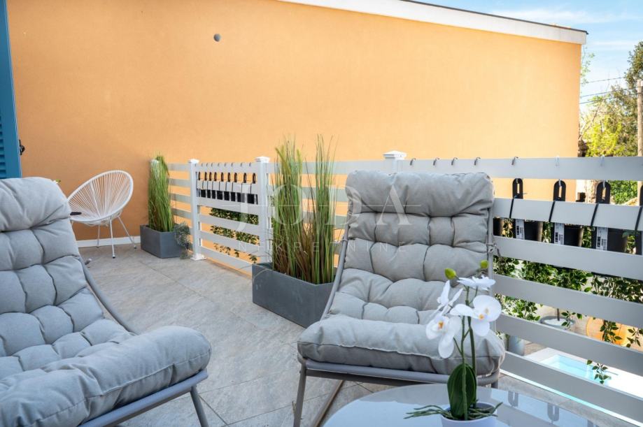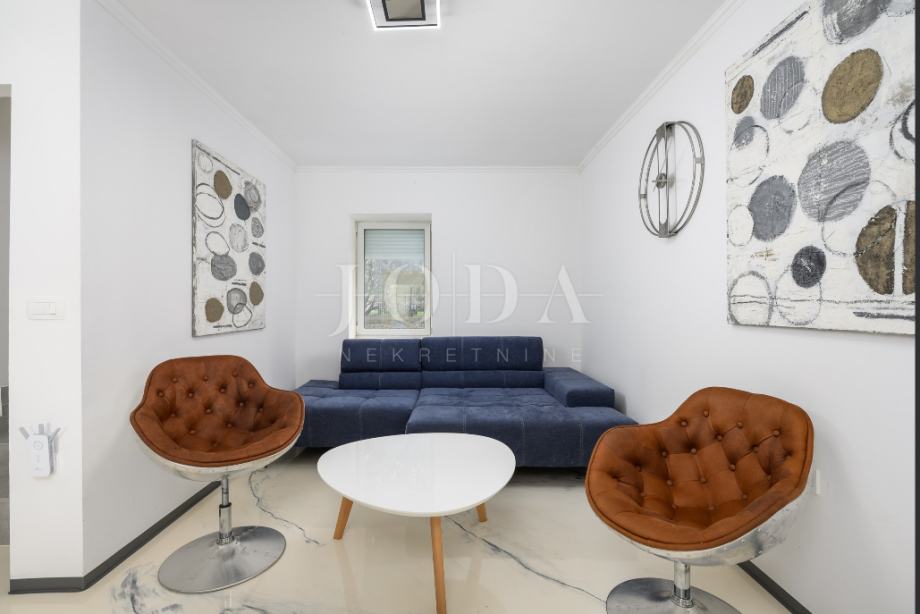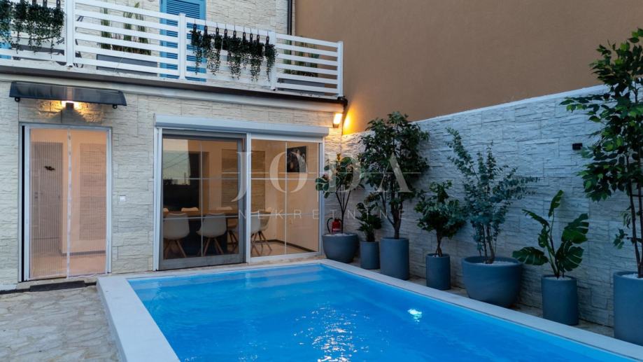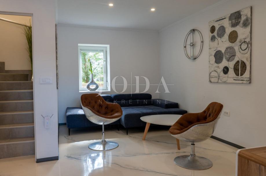 Stambena površina od 140 m2 sastoji se od prizemlja i dvije etaže, a uz nju se nalazi otvoreni bazen(sistem elektrolize) sa sunčalištem koji se može koristiti tokom cijele godine.