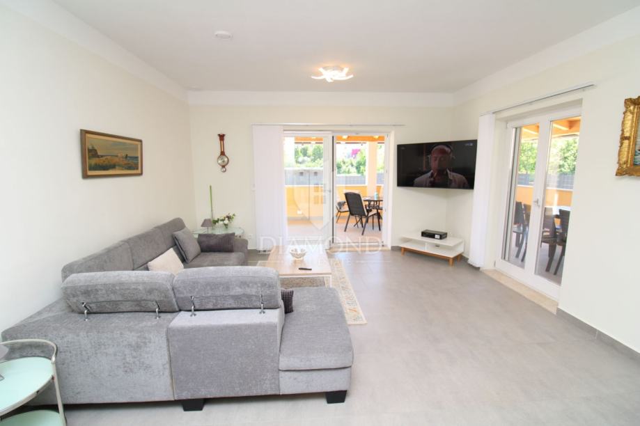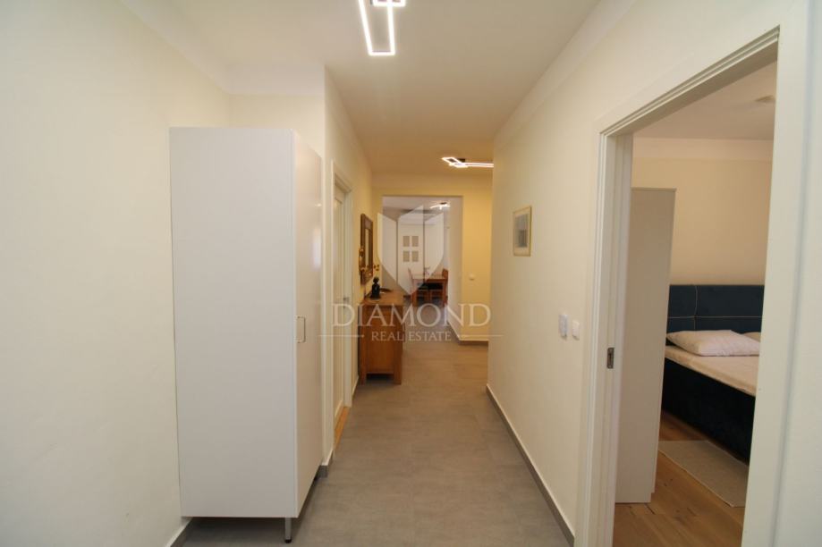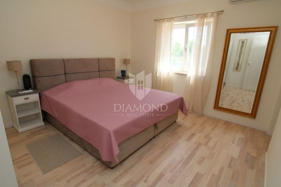 Nekretnina se sastoji od tri prostrane spavaće sobe svaka sa vlastitom kupaonom, pomoćng toaleta, vešeraja te prostranom kuhinjom sa blagovaonom i dnevnim boravkom. Dnevni i blagovaona su povezani sa prostranom natkrivenom terasom koja vodi do bazena i sunčališta. U sklopu kuče nalazi se i garaža sa atelijeom iznad nje. Kuća je opremljena solarnim panelima, podnim grijanjem te je u potpunosti klimatizirana. Stolarija u kombinaciji drva i aluminija.