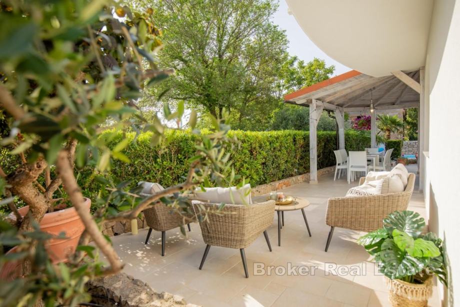 Okućnica površine oko 400 m² ograđena je i uređena mediteranskim biljem. Na njoj se nalaze grijani bazen sa slanom vodom, terase, ljetna kuhinja te dva parkirna mjesta.
