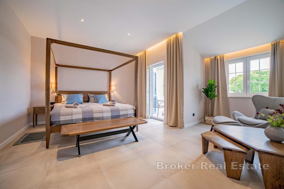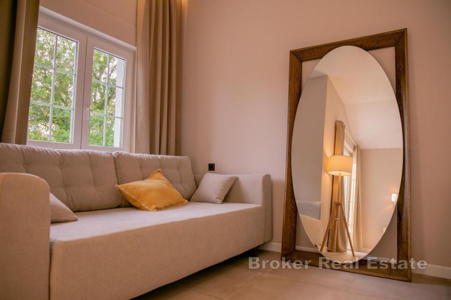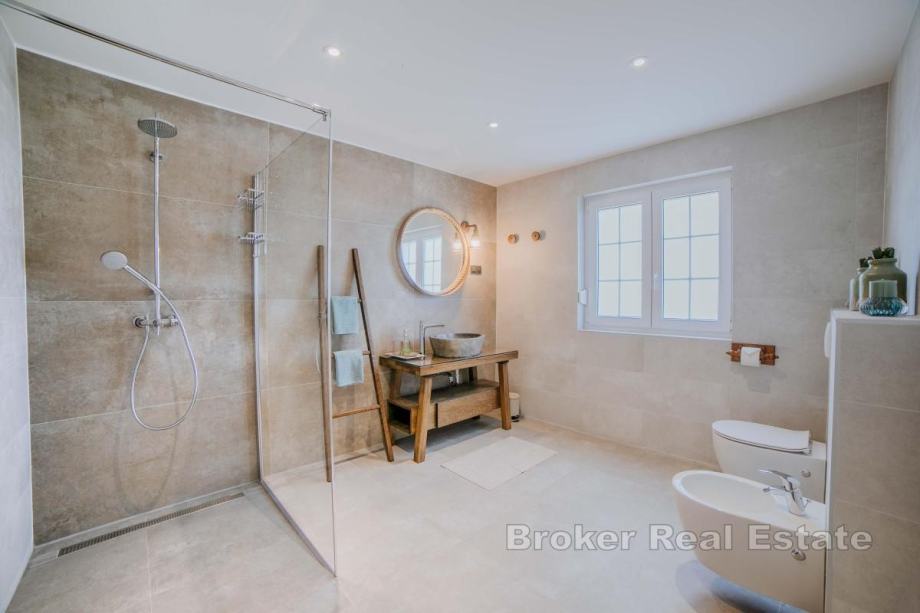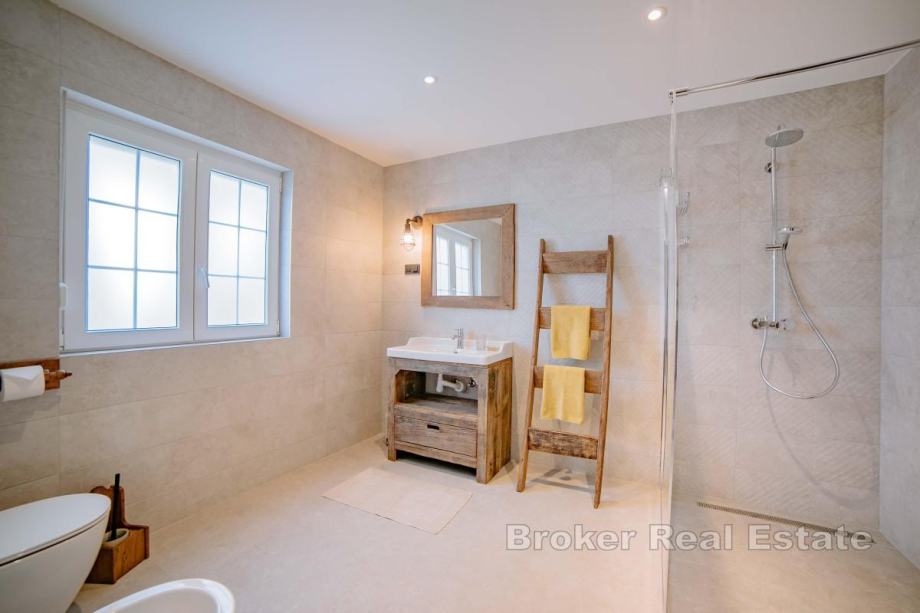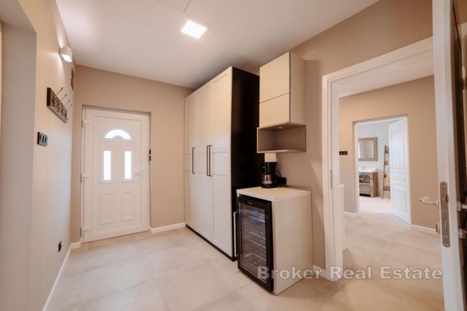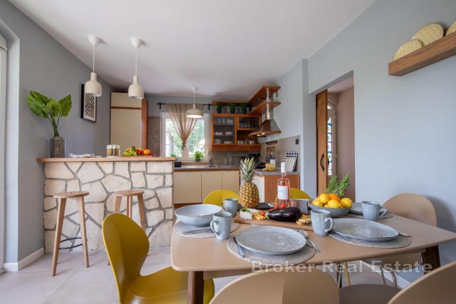 Pri renovaciji korišteni su kvalitetni materijali, ugrađena je PVC stolarija visoke kvalitete, podne obloge i sanitarije. Kuća je u potpunosti namještena i opremljena, klimatizirana te ima električne norveške radijatore.