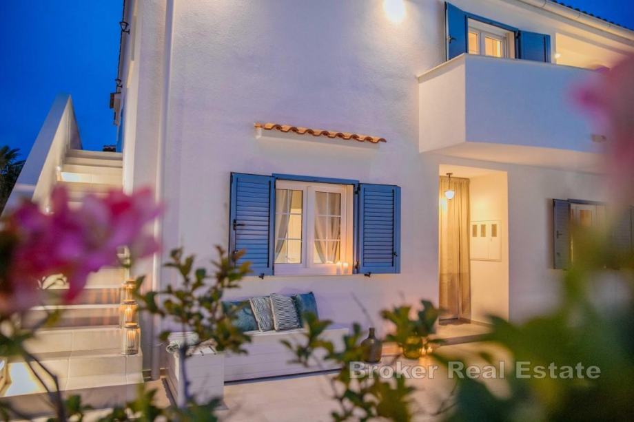 Na mirnoj lokaciji u uvali Soline, samo 90 metara od mora, prodaje se samostojeća kuća s mediteranskim arhitektonskim obilježjima. Stambena površina od 230 m² raspoređena je na prizemlje i kat.