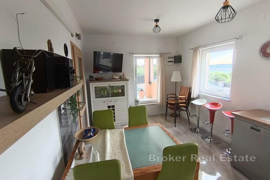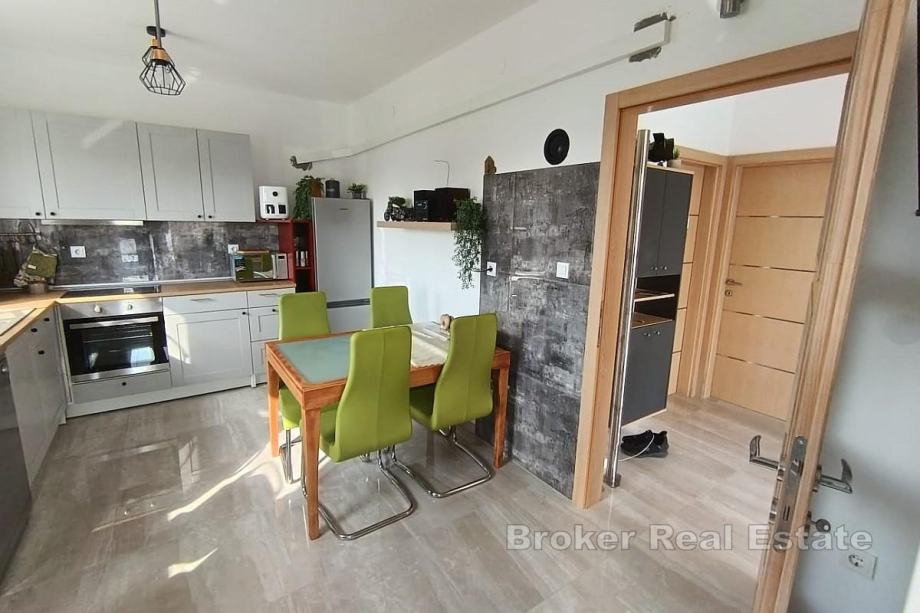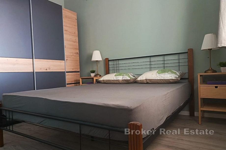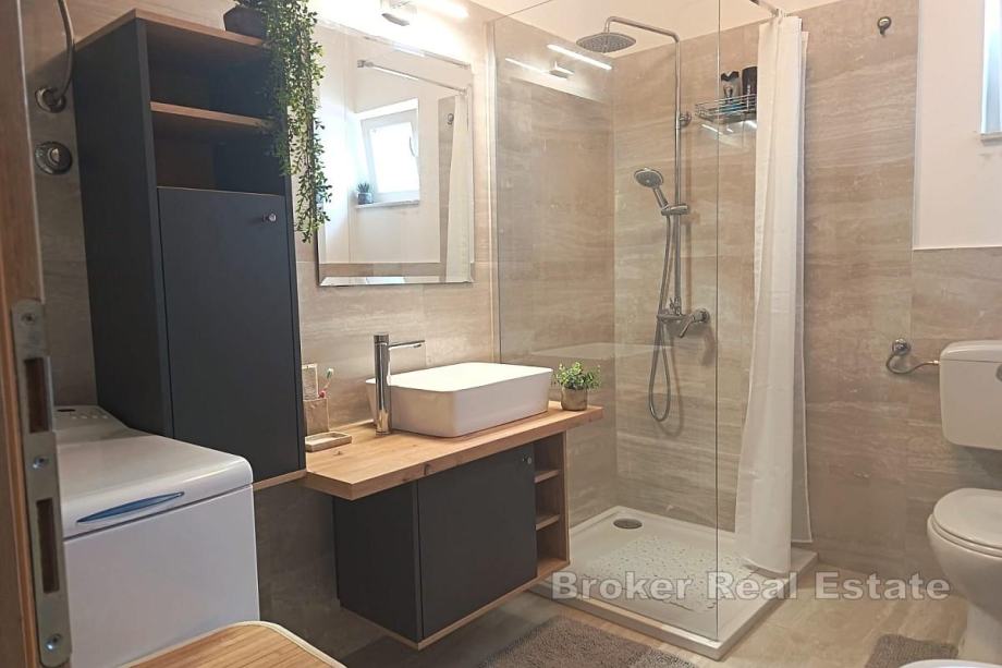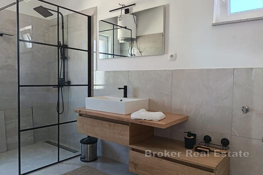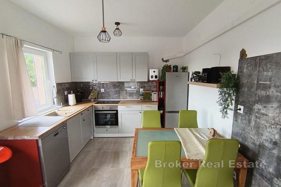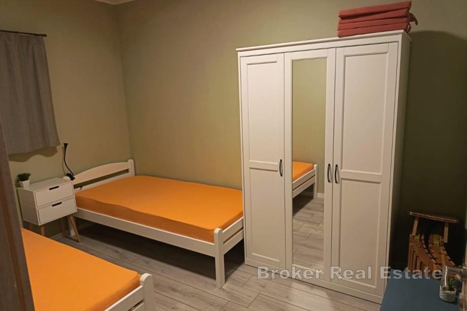 U prizemlju se nalazi potpuno opremljen stan s dvije spavaće sobe, kuhinjom s blagovaonicom, kupaonicom, hodnikom i ostavom. Također prizemnom stanu pripada natkrivena terasa i roštilj.