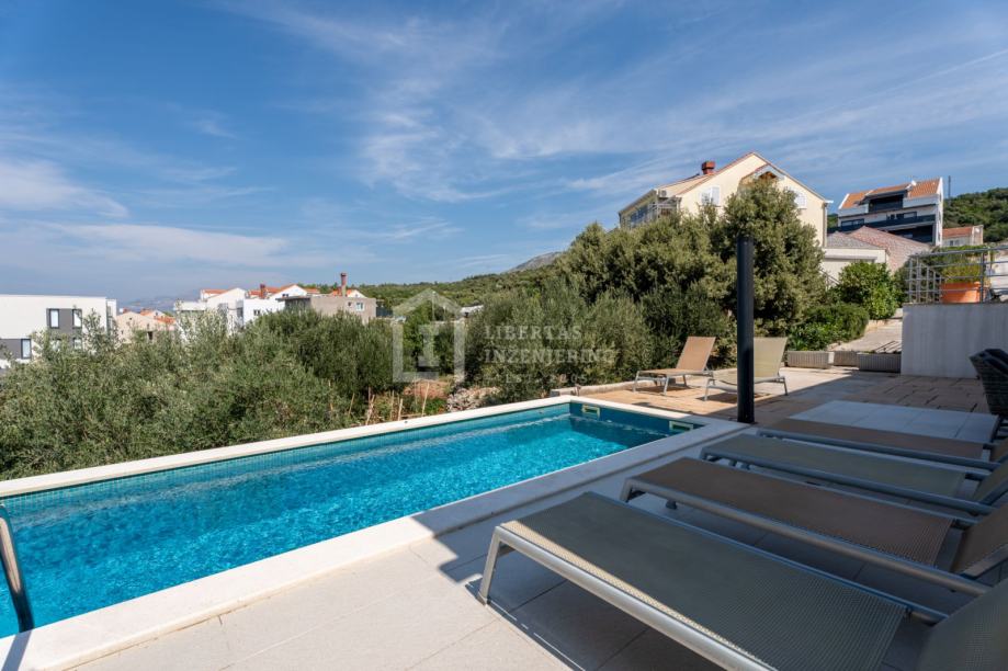 U prizemlju su tri spavaće sobe, kupaonica i dnevni boravak povezan s kuhinjom i blagovaonicom. Iz dnevne sobe izlazi se na dio terase s bazenom i pogledom na more.