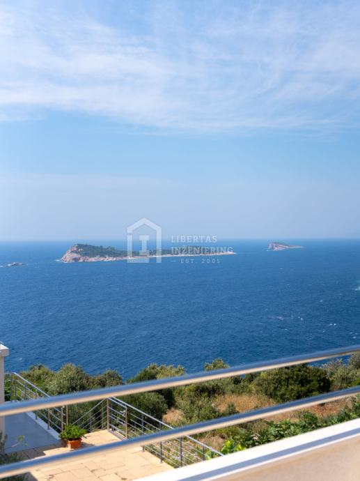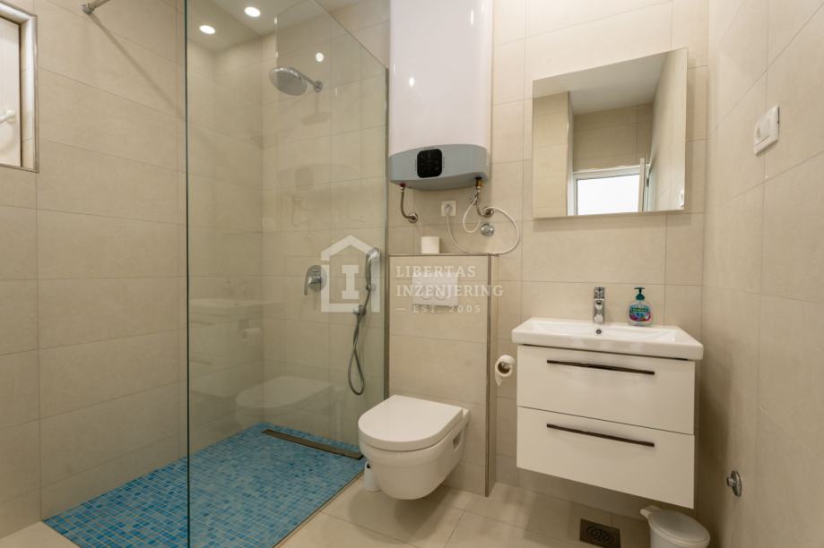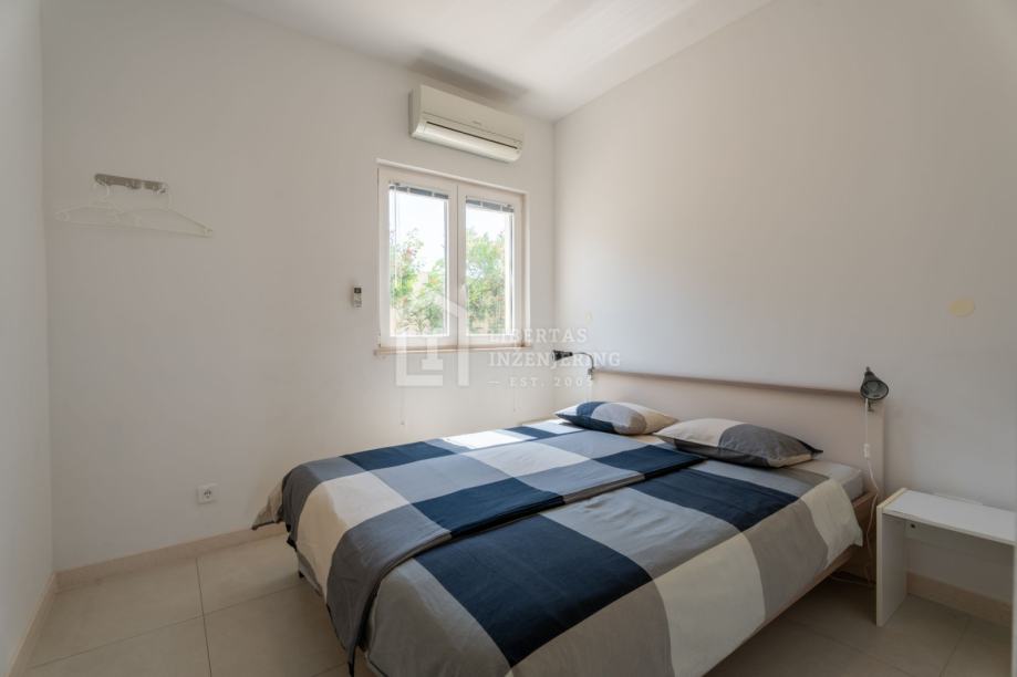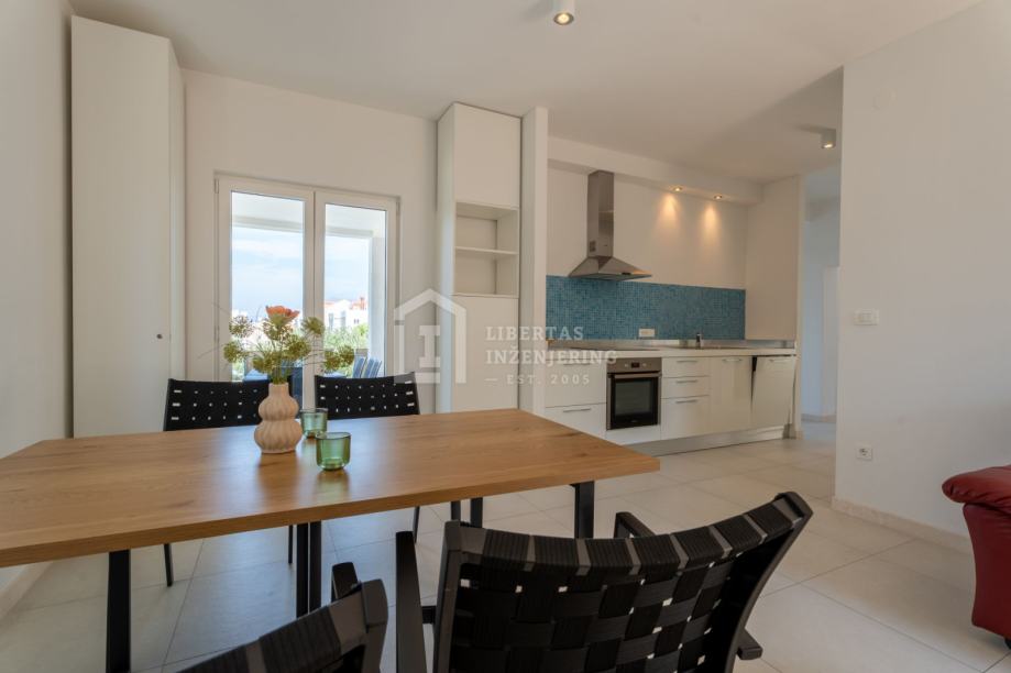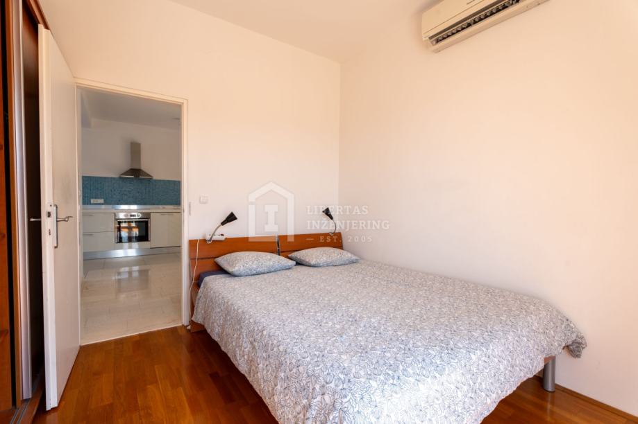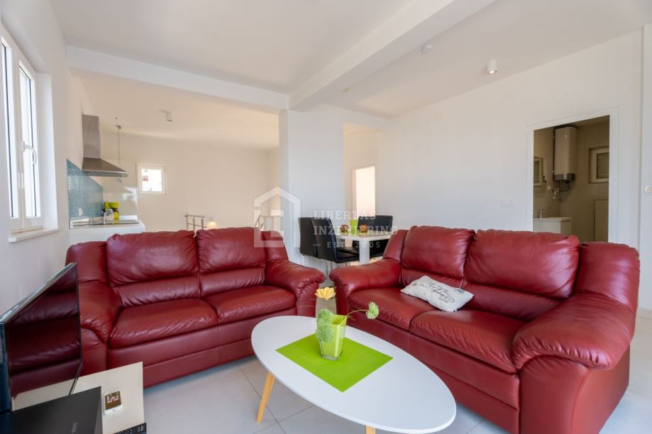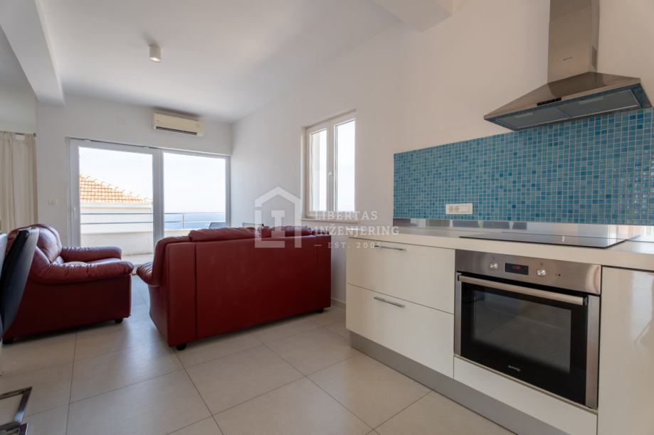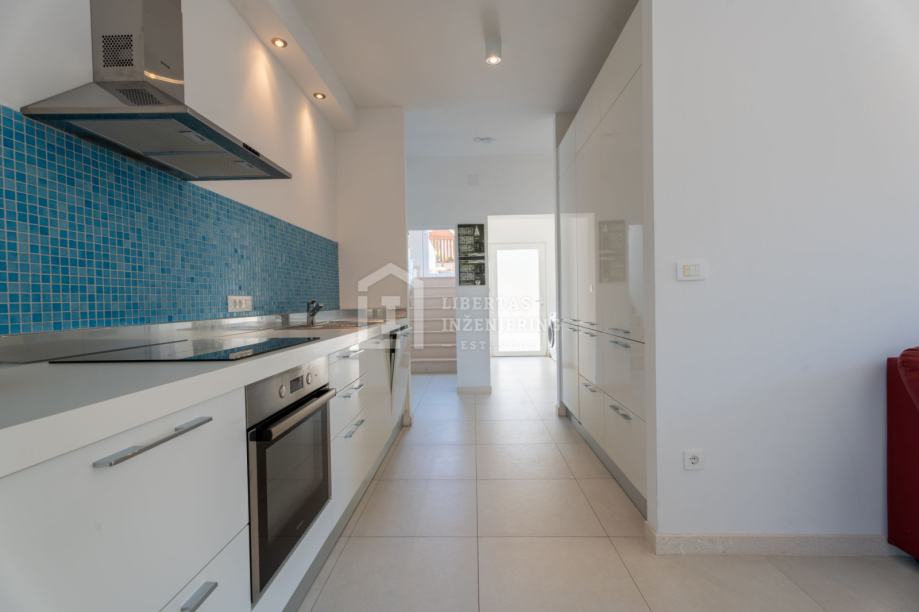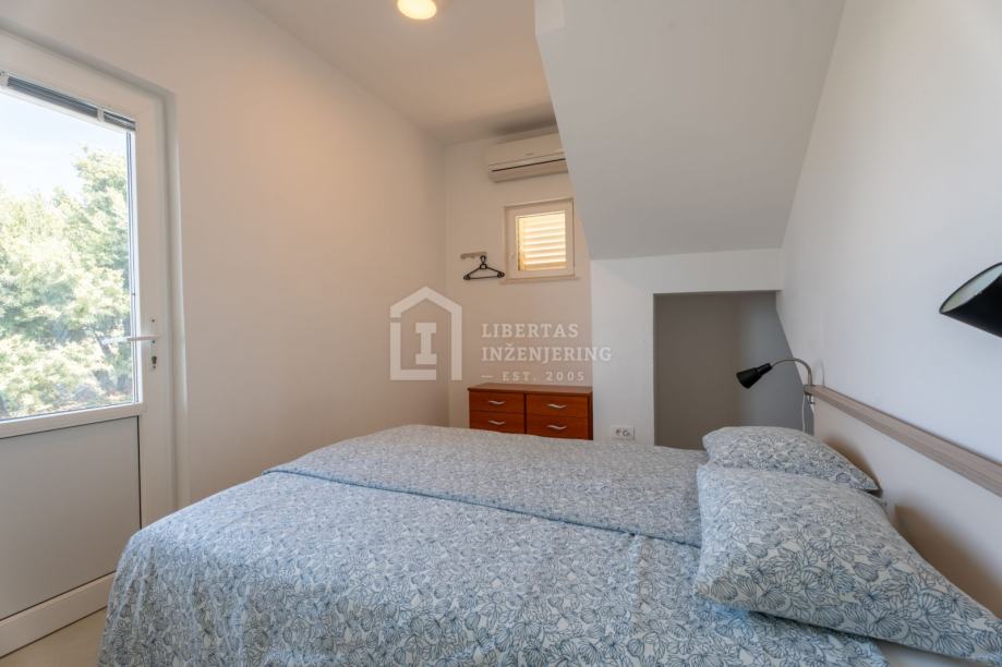 Na gornjoj etaži je stan s dvije spavaće sobe, dvije kupaonice te kuhinja i dnevni boravak s blagovaonicom. Iz dnevne sobe pruža se pogled na morsko plavetnilo.