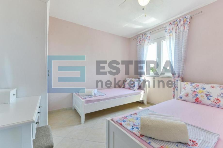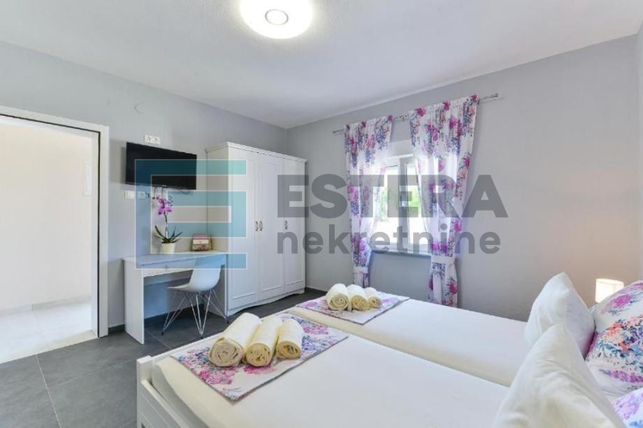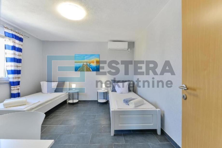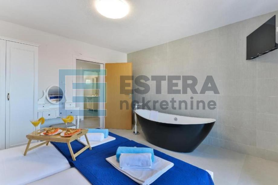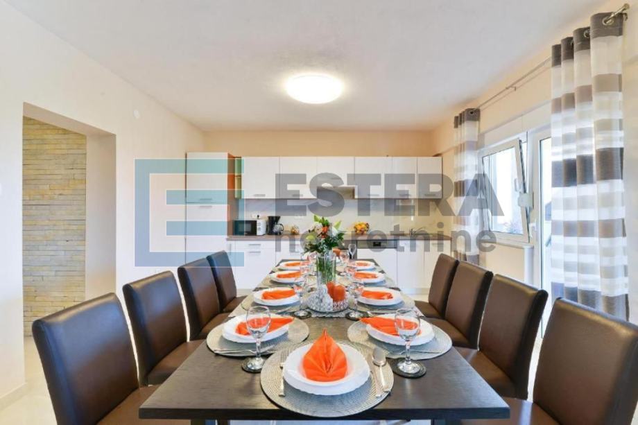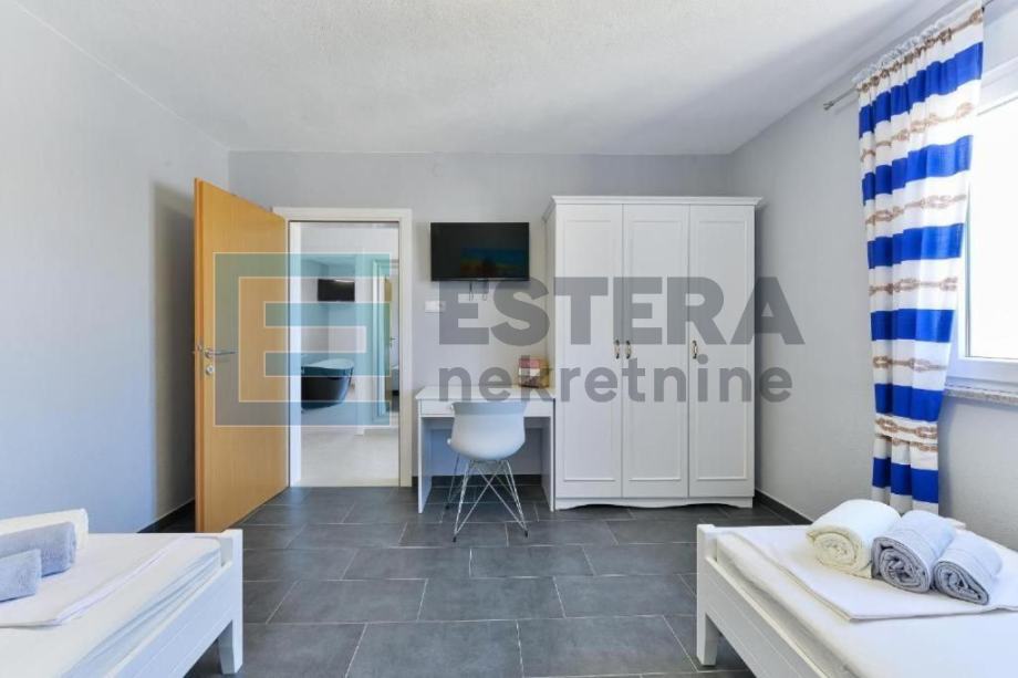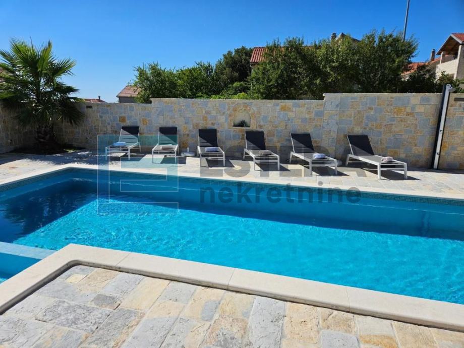 Prostrana vila ima 6 odvojenih spavaćih soba, 5 kupaonica, potpuno opremljenu kuhinju s blagovaonicom i perilicom posuđa te dnevni boravak s TV-om. Ispred dnevnog boravka nalazi se velika natkrivena terasa koja gleda na bazen. Kuća također ima i konobu.
