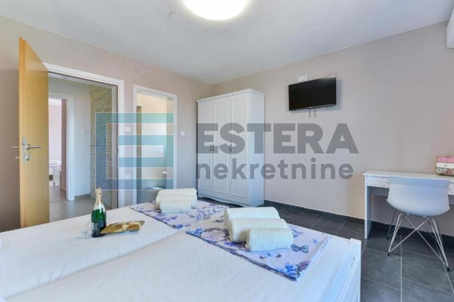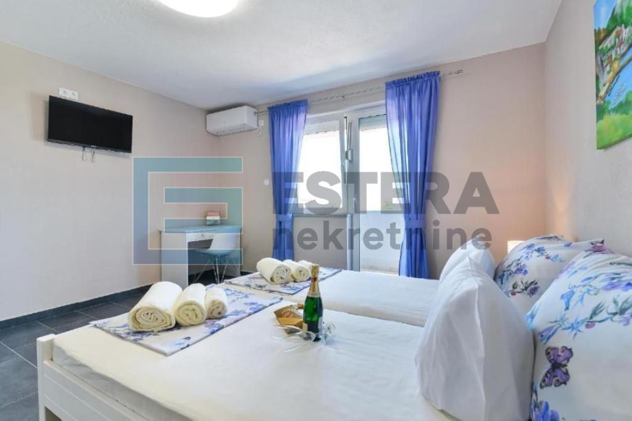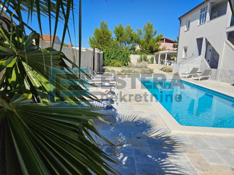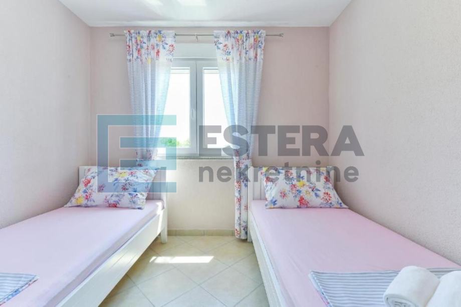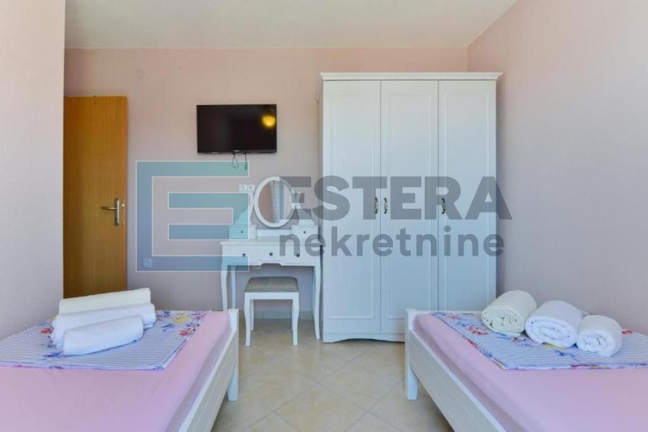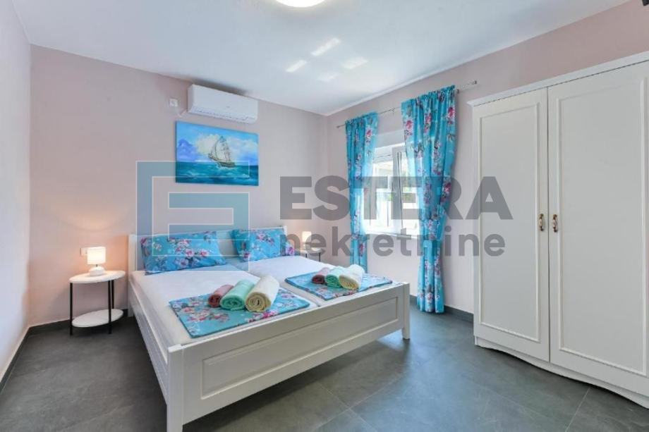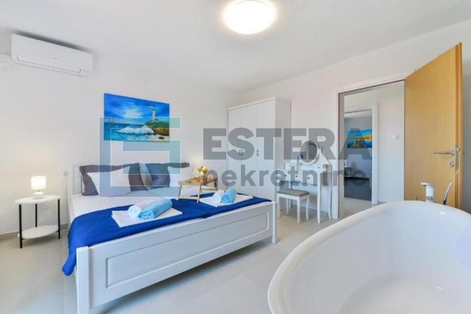 Prostrana vila ima 6 odvojenih spavaćih soba, 5 kupaonica, potpuno opremljenu kuhinju s blagovaonicom i perilicom posuđa te dnevni boravak s TV-om. Ispred dnevnog boravka nalazi se velika natkrivena terasa koja gleda na bazen. Kuća također ima i konobu.