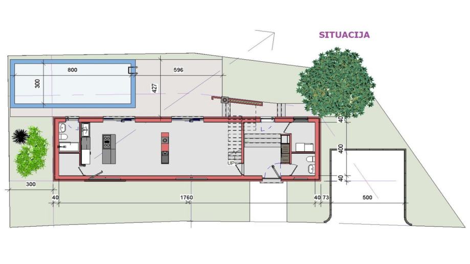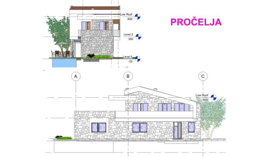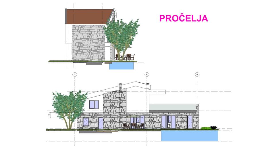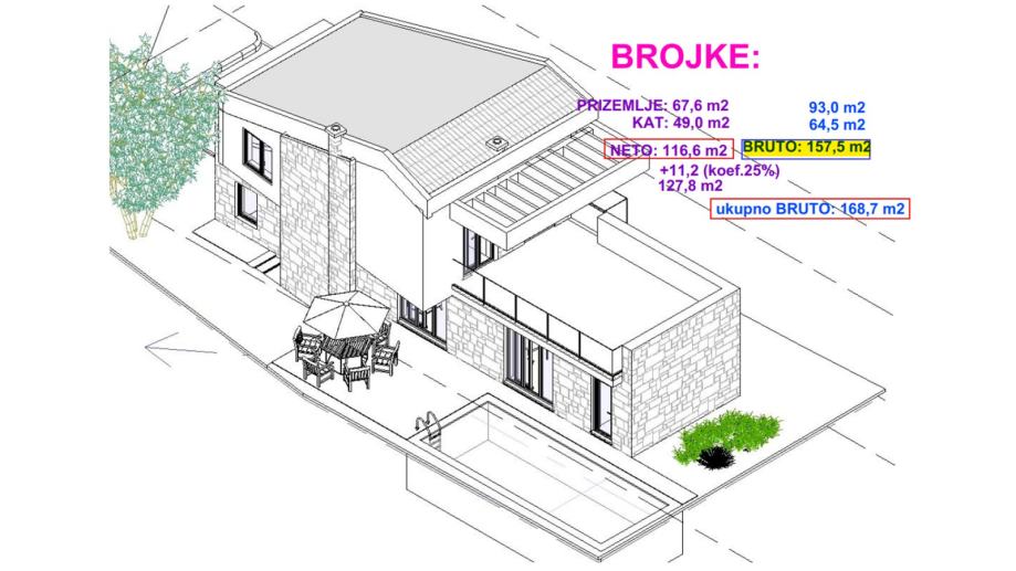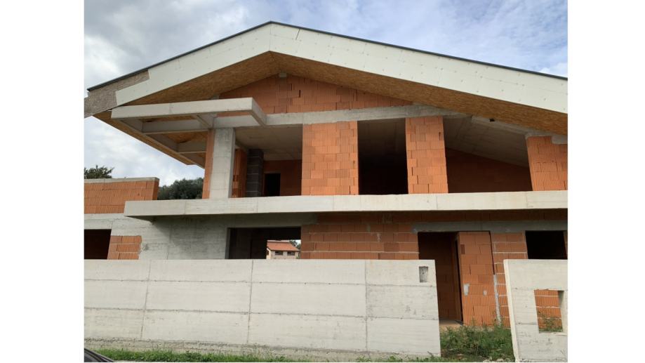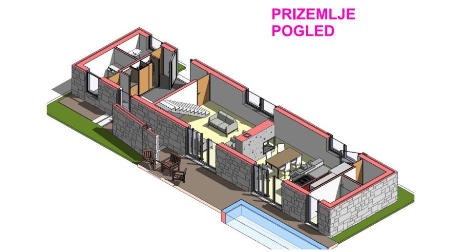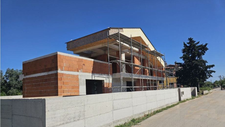 Na prodaju kuća s bazenom u roh-bau građevinskoj fazi. Kuća se sastoji 127 m2 stambenoga prostora na dvije etaže. U prizemlju kuće smješten je hodnik, "open space" dnevni boravak, blagovaona i kuhinja te manje spremište i gostinjski toalet U prizemlju se nalazi i spavaća soba s vlastitom kupaonom.
