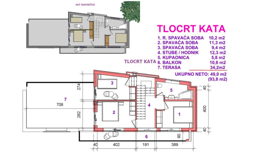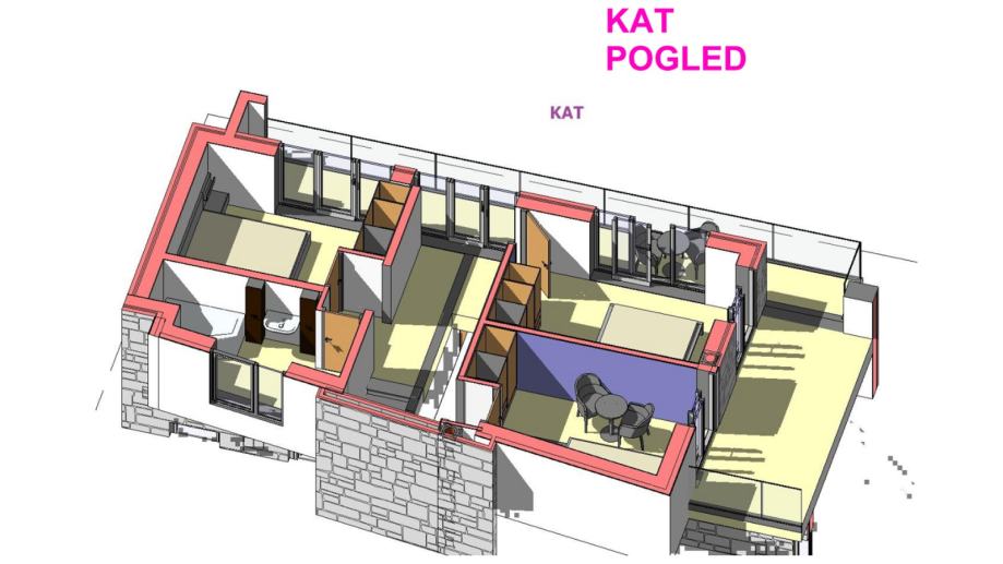 Na katu su smještene dvije spavaće sobe, od kojih svaka posjeduje vlastitu kupaonicu, kao i vlastitu terasu s pogledom na more.