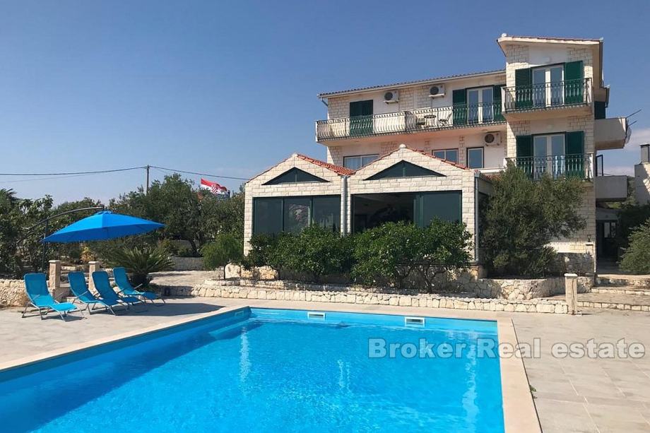 Kuća na 3 etaže sa bazenom i restoranom. Ima prekrasan panoramski pogled na more.