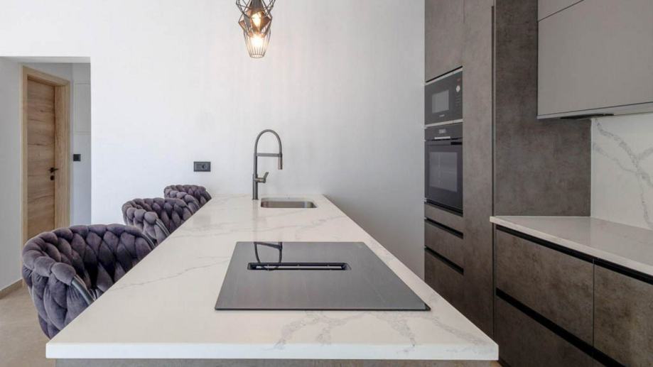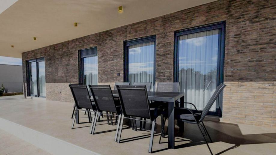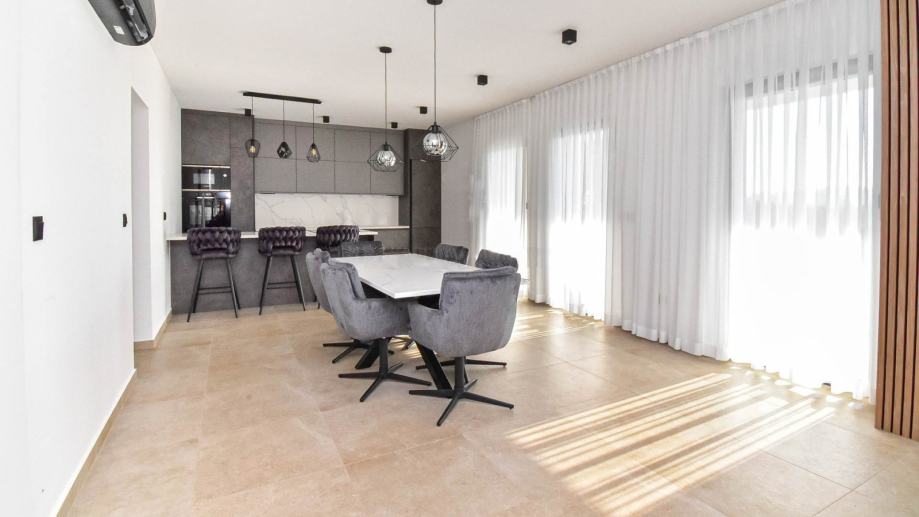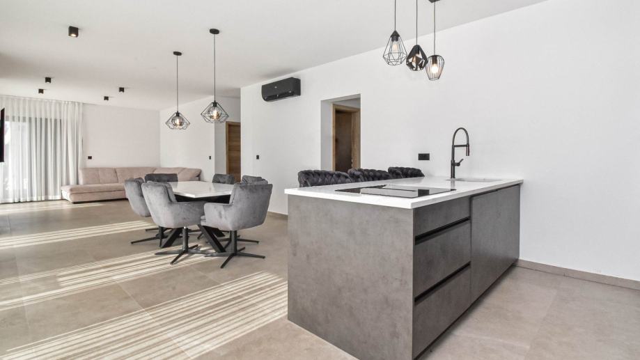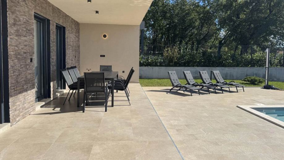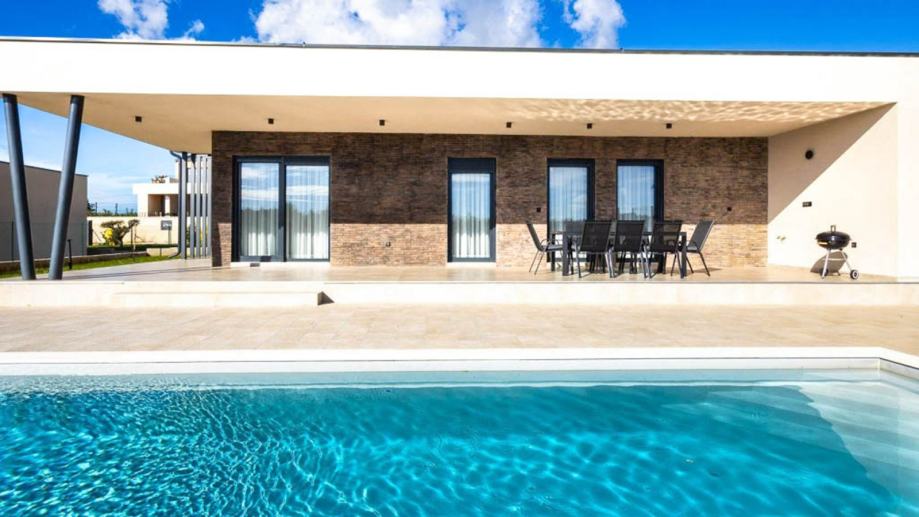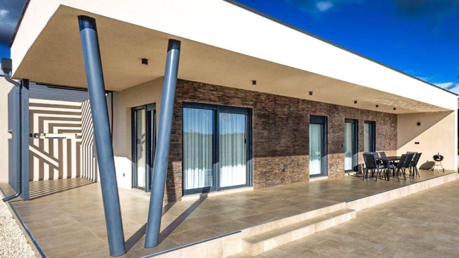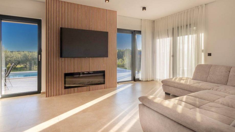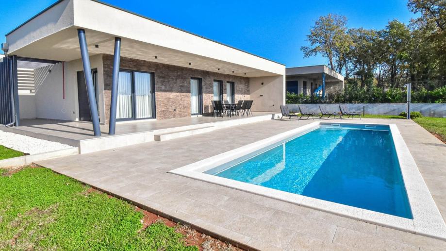 Moderna prizemnica s bazenom i dvije spavaće sobe, vrtom i parkirnim mjestima. Ova nekretnina nalazi se u mirnom istarskom selu i idealna je kao kuća za odmor ili za cjelogodišnji život. Kuća ima neto stambenu površinu od 98 m² i nalazi se na parceli od 673 m². Sastoji se od ulaznog hodnika, kupaonice za goste i jedne spavaće sobe, koja vodi u prostrani dnevni boravak otvorenog tipa, blagovaonicu i kuhinju. Dnevni boravak se s dvije strane otvara na natkrivenu terasu koja vodi do sunčane terase i bazena s tušem te pruža prekrasan pogled na maslinik. Iz kuhinje se pristupa spavaćom dijelu koji uključuje drugu spavaću sobu i još jednu kupaonicu. Grijanje i hlađenje osiguravaju tri unutarnje klima jedinice instalirane u svim sobama, dok umjetni kamin u dnevnom boravku dodaje toplinu i atmosferu tijekom zimskih mjeseci. Kuća se prodaje potpuno namještena i opremljena novim namještajem i aparatima, uključujući: kuhinju s otokom, perilicu posuđa, pećnicu, mikrovalnu pećnicu, hladnjak, indukcijsku ploču za kuhanje s ugrađenom napom, TV od 160 cm u dnevnom boravku i TV od 82 cm u svakoj spavaćoj sobi, 3 klima uređaja za grijanje i hlađenje, umjetni kamin u dnevnom boravku za dodatnu udobnost. Uređeni vrt nudi dovoljno parkirnih mjesta za nekoliko vozila i ugodan vanjski prostor za opuštanje uz bazen od 30 m² (3x10 m) i sunčane terase. Za više informacija i dogovor obilaska, molimo kontaktirajte nas.