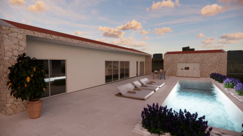 Odlična kuća prizemnica na prostranoj parceli locirana u okolici Tinjana. Kuća površine 115 m2 sastojati se od ulaznog prostora, prostranog dnevnog boravka s kuhinjom i blagovaonicom, hodnika, dvije spavaće sobe s vlastitim kupaonicama, toaleta, spremišta i terase. Uz kuću je pomoćni objket površine 40 m2 koji se može prilagoditi različitim potrebama.