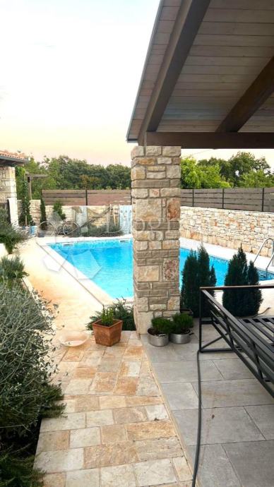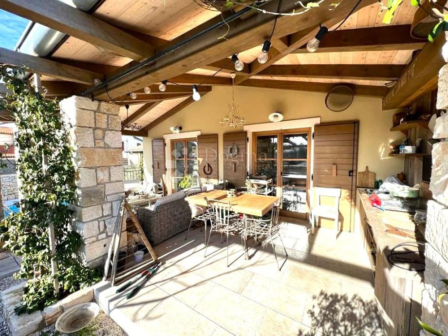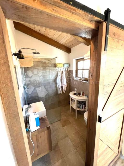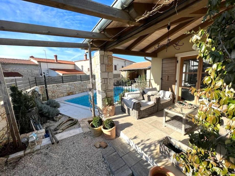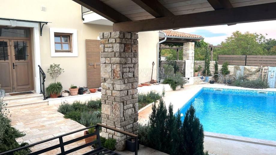 U srcu istarskog poluotoka, predstavljamo Vam očaravajuću nekretninu koja je okružena tradicionalnim kamenim zidom, stvarajući idiličan ambijent. Okućnicu krase mediteransko bilje i njeno održavanje očarat će Vas već pri prvom pogledu. Središte ove nekretnine zauzima bazen površine 32 m2, oko kojeg se pruža prostor za sunčanje, savršeno mjesto za opuštanje.